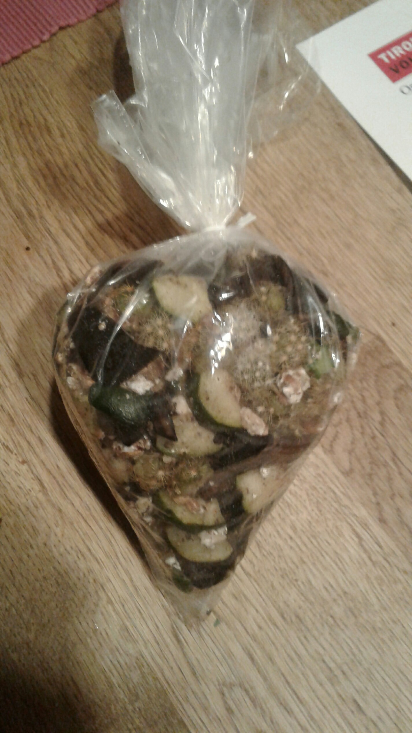 der Zucchini ist mir erst eingefallen, da ist er schon einen halben Tag im bio müll gelegen. Er war nicht schimmlig oder schleimig nur gummig und Kühlschrank getrocknet. Ich habe ihn abgewaschen und dann wie alles andere geschnitten.