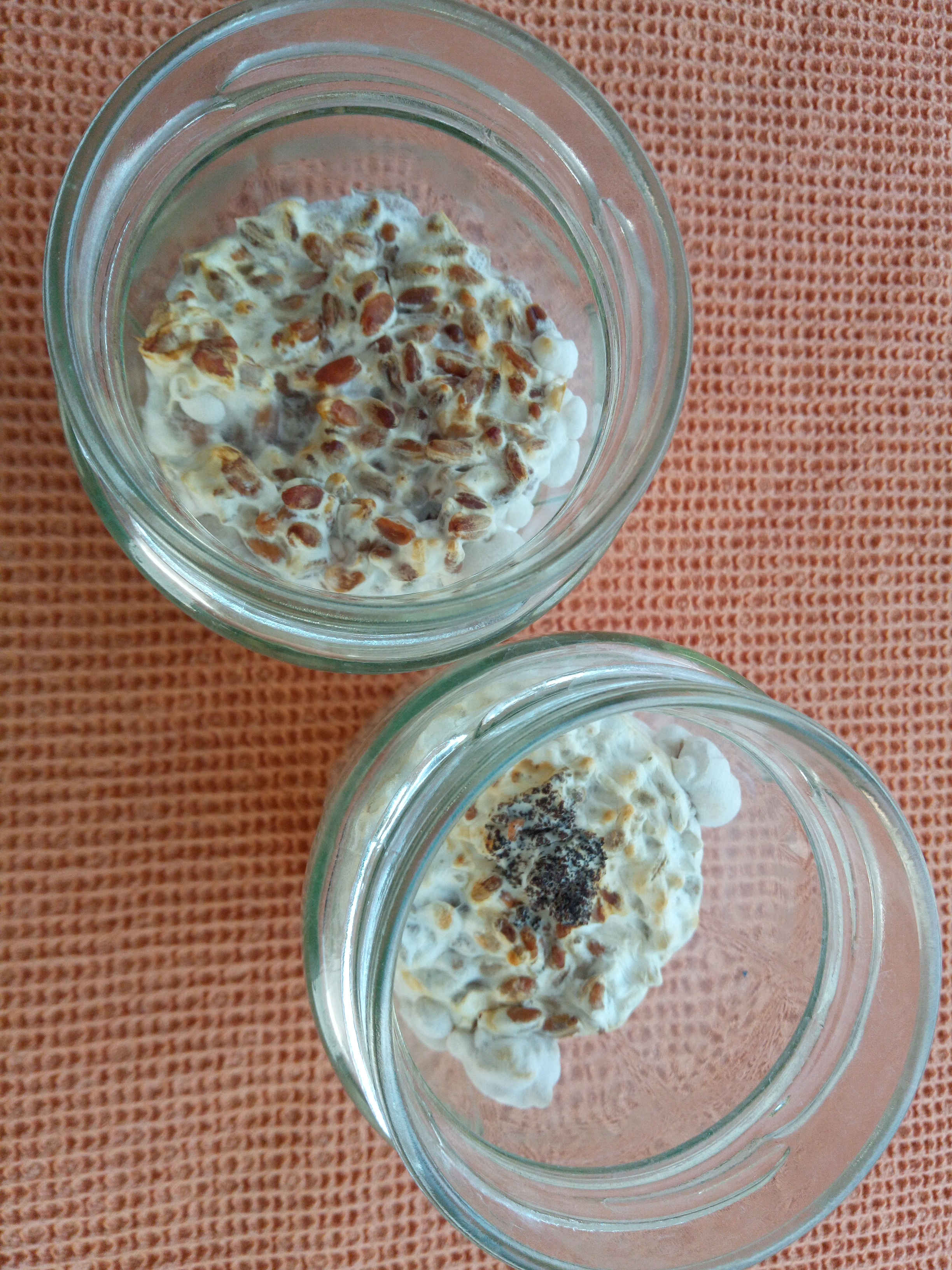 Liebe alle, im Juli hatte ich ja meine erste mini-KS-Körnerbrut erzeugt, und mit den Gläsern wusste ich nicht so richtig wohin - also habe ich den größten Teil mit Stroh und Holz angesetzt und zwei Gläser in den Kühlschrank gestellt und immer mal etwas gewässert.