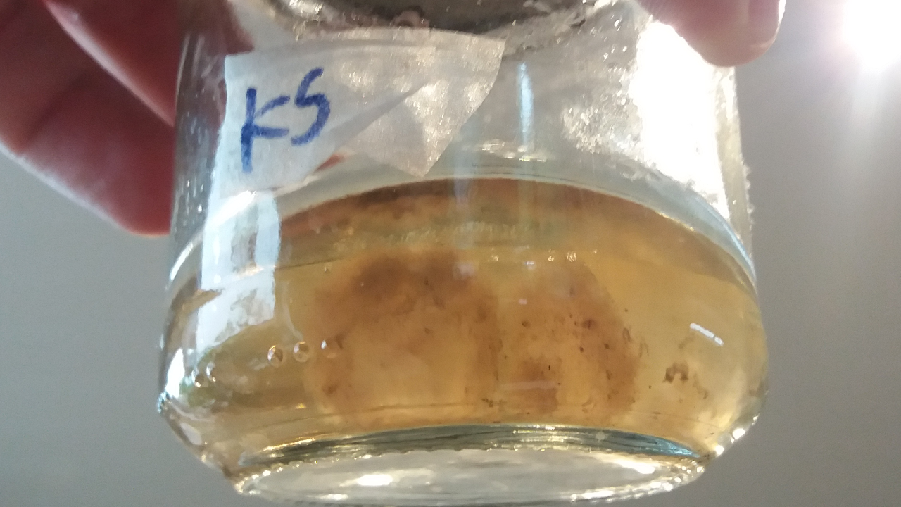 Ich habe eine Nährlösung aus 5% Honig / 95% Wasser mit einem Stück sauber durchwachsenen Agarnährbodens (Kräuterseitling aus dem Supermarkt) beimpft. Das Einmachglas war für zwanzig Minuten zum Sterilisieren im Schnellkochtopf, ist über ein mit Micropore-Kleber verschlossenes Loch im Deckel belüftet und stand seitdem in einem Kellerraum (kaum Licht, etwa 15°C). Beimpft wurde in einer Impfbox. So sieht das Ganze nach einer Woche aus (mir ist die schlechte Bildqualität bewusst, ich habe leider nur die Handykamera mit Fokussierschwierigkeiten):