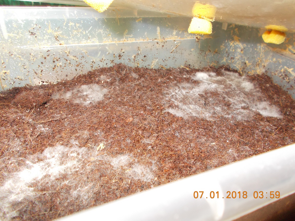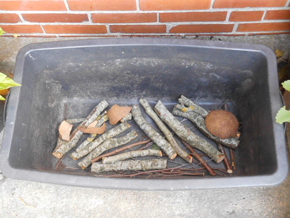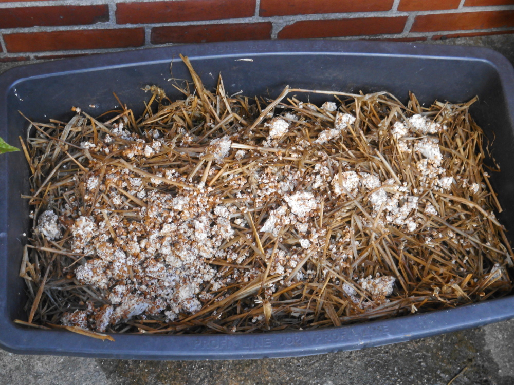 Maurerbütt mit Ablauflöchern als Behälter: Fermentiertes Stroh mit ein bisschen Gips als Basis für die Auster soll mit Körmerbrut beimpft werden. Das Ganze füllt so 1/3 eines Mörtelkastens, darauf kommt Schreddergut und frisches Stroh und als Abschluss eine 10-15cm Schicht Erde.