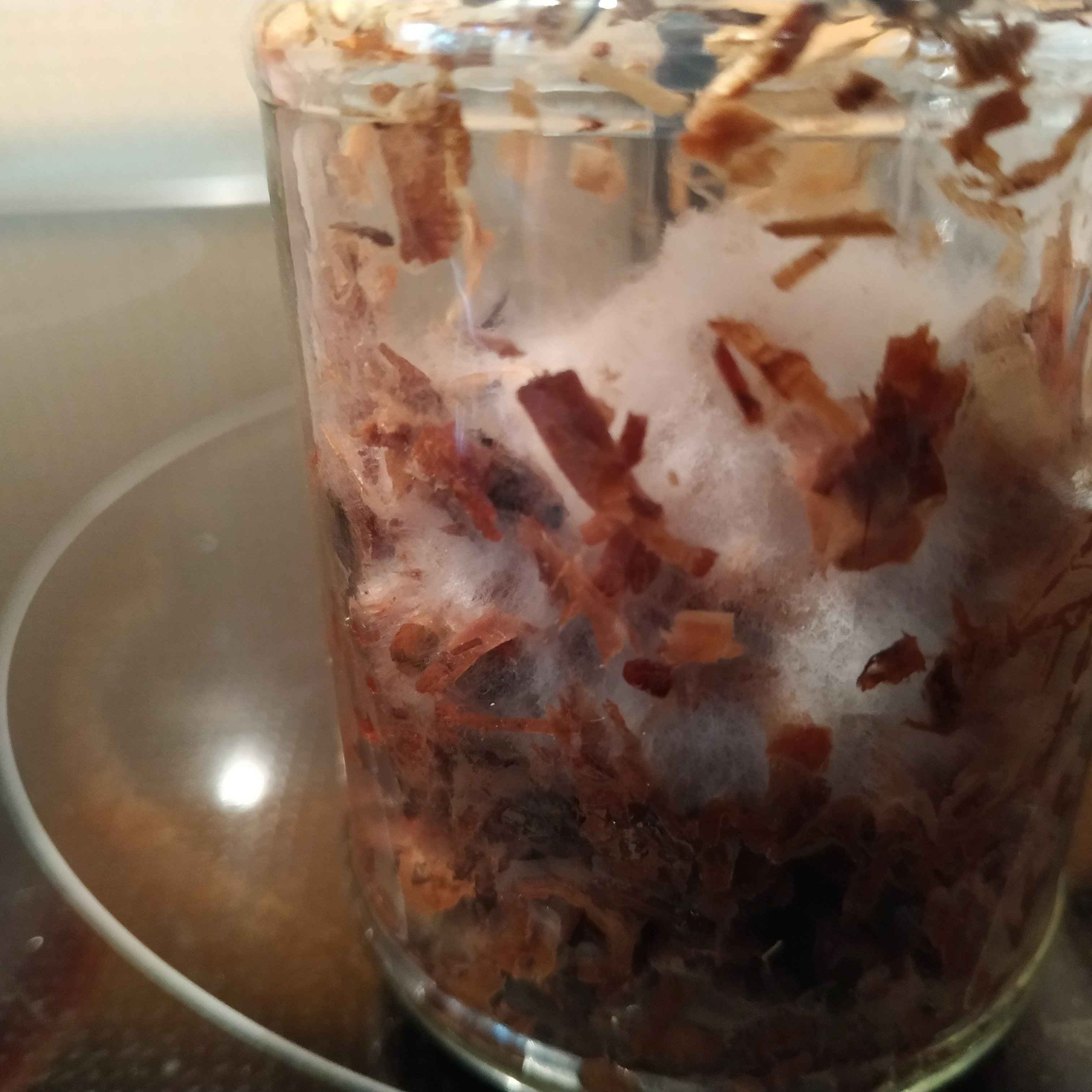Ja, sie wächst... aber fürchterlich langsam. Bei dem Tempo wird sie früher oder später von einer Kontaminante überholt.... Ich bin überzeugt, dass Kiefernholz hier deutlich besser wäre. Leider ist es schwieriger als gedacht an solche Holzspäne in kleinen Mengen zu kommen. Und Sorten-rein schon gar nicht...