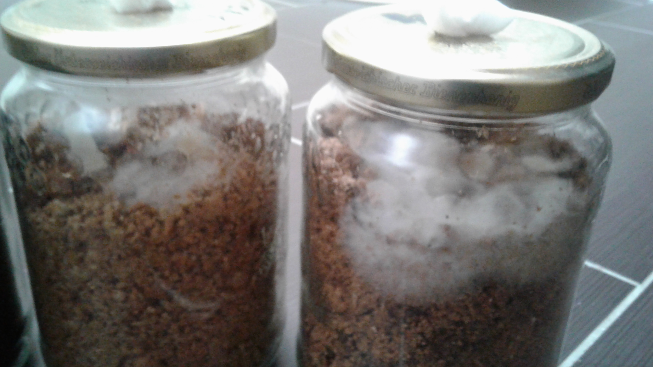 Glas1: Fichtensägemehl ~ 2 Wochen fermentiert ~ 4 % Buchensägemehl ~ 1% Wurm/Käferscheiße 65% Substratfeuchtigkeit (Leitungswasser)-> null Wachstum