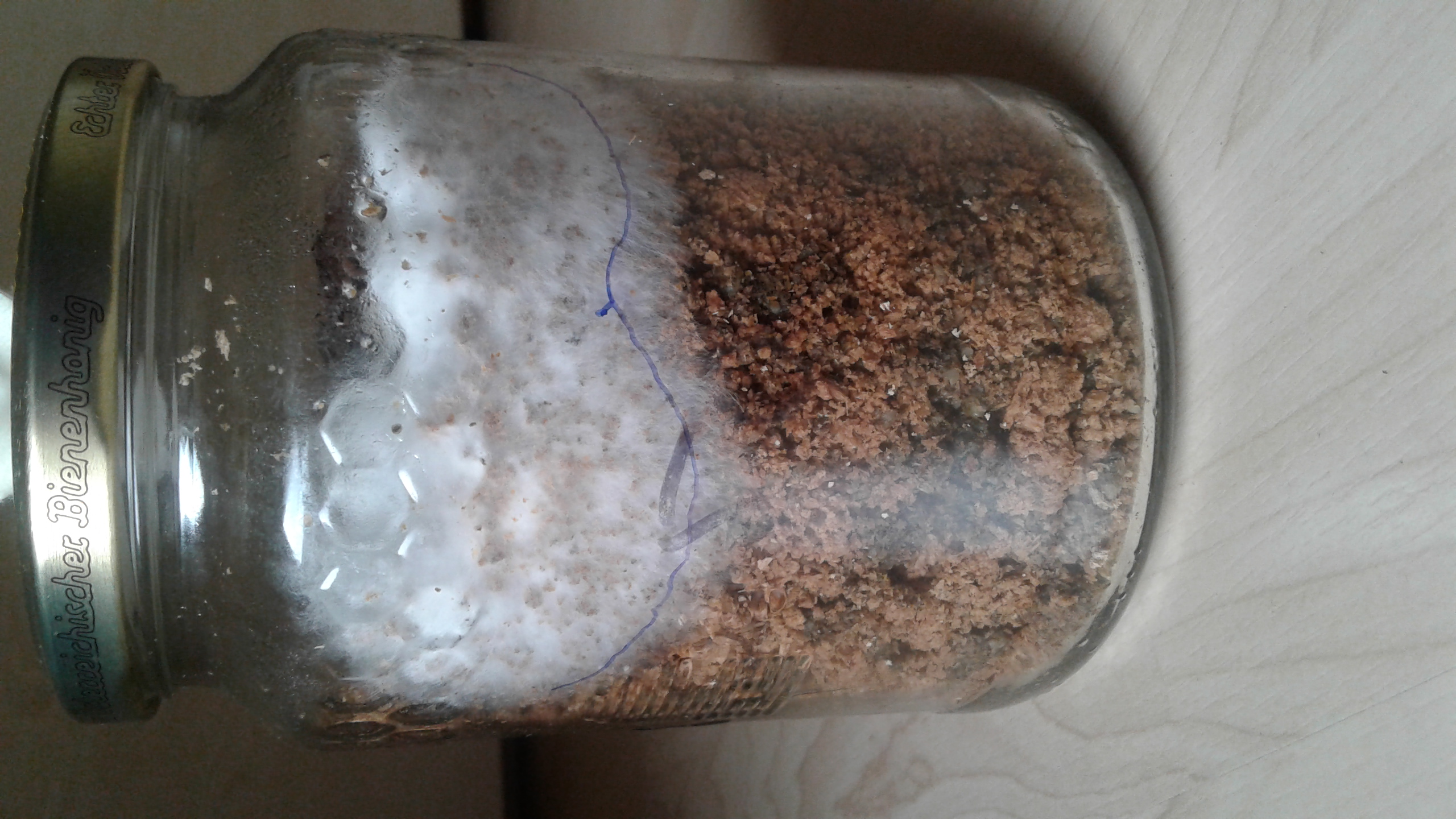 am 2.5 habe ich 4 Substratgläser beimpft. obiges Glas ist bis jetzt das schönste. Buchensägemehl Pferdefutter 65% Substratfeuchtigkeit (auf einen halben Liter Leitungswasser 1 Teelöffel 6%iger Walnussessig)
