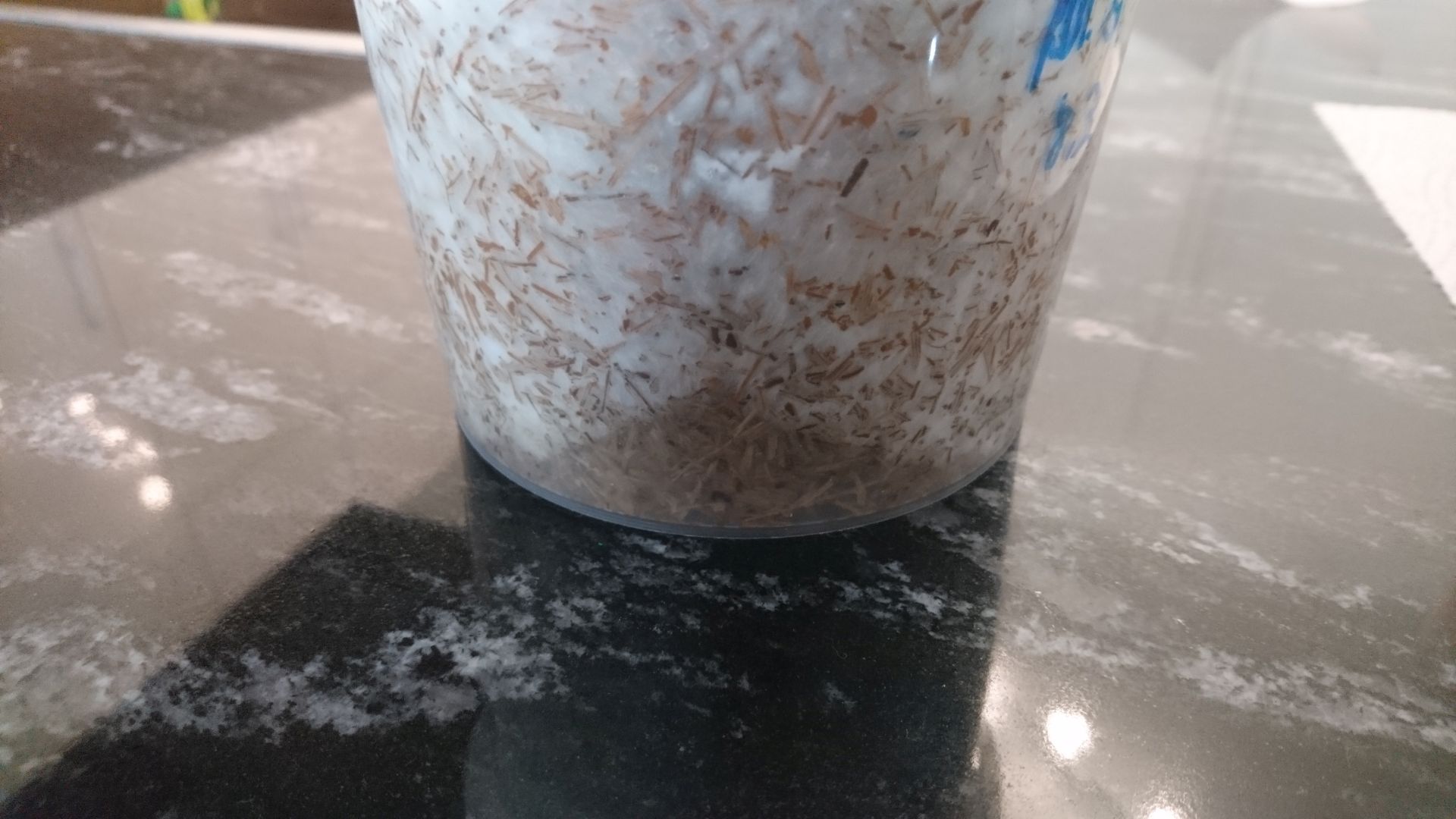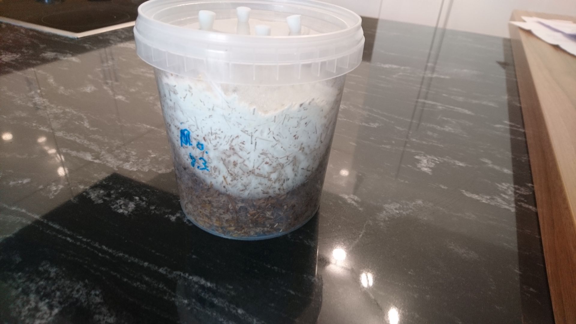 Nachdem er unten nur sehr langsam weiter wächst, vermutlich zu wenig Sauerstoff, habe ich den jetzt in eine Fruchtungsbox übersiedelt. Zudem Oberfläche etwas angekratzt und für 24h Wasser drauf.