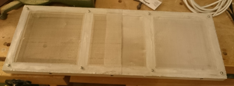 Inzwischen hab ich den Lufteilass für die Reinbank fertig. Zwischen das Alugitter und die Spanplatte kommt ein Fließ als Vorfilter.