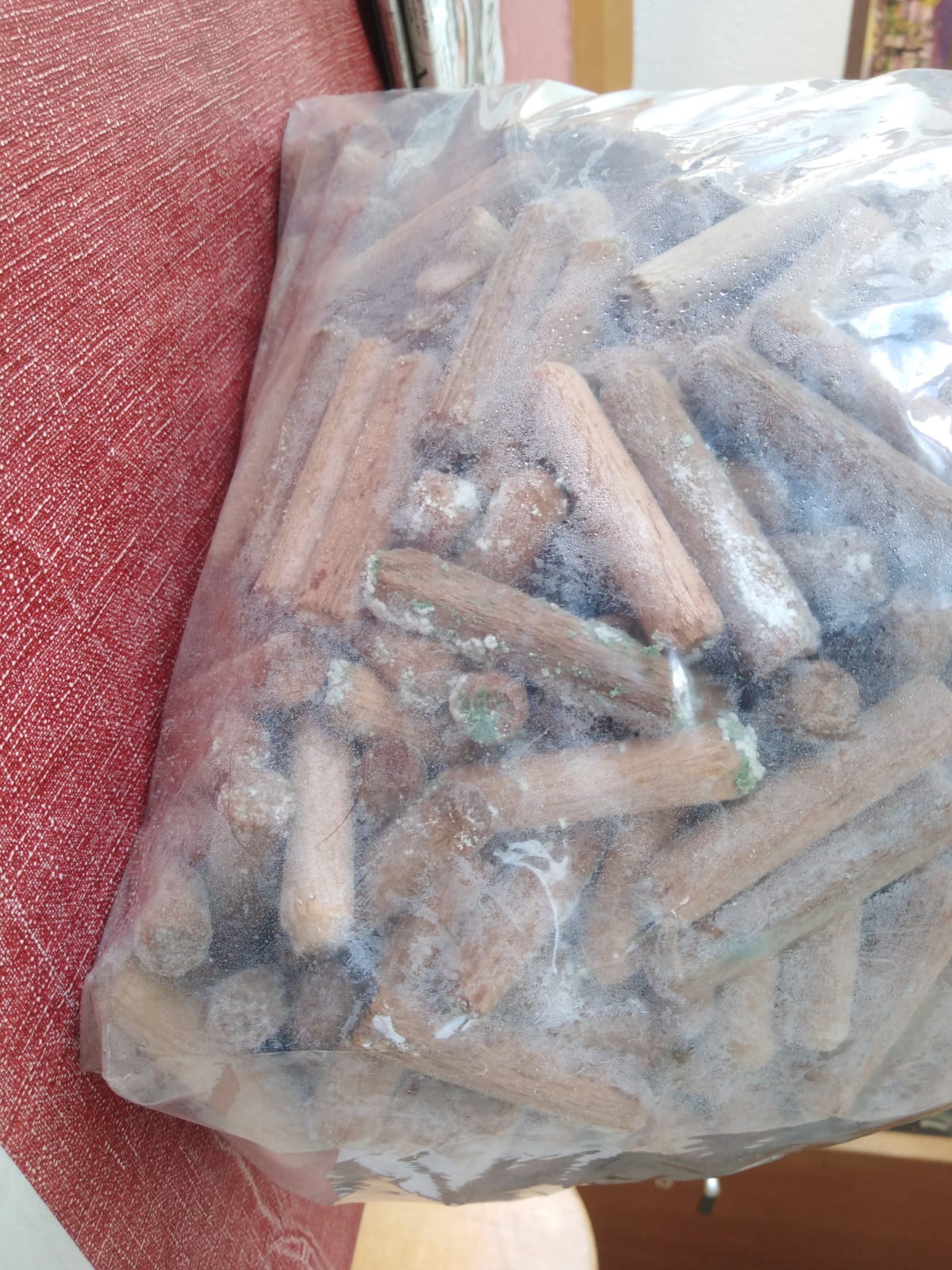 Ich hab ja 4 von den Säcken, die haben aber alle Kontis. Der grüne Schimmel ernährt sich so weit ich weiß sogar noch von dem Shiitake-Myzel, also ist nicht einfach nur Konkurrenz. Beim letzten mal hatt ich auch was grünes drin und hab dann einfach die Dübel genommen die gut aussahen und die grünen weggeworfen. Aber diesmal ist glaub zu viel grünes Zeug drin.