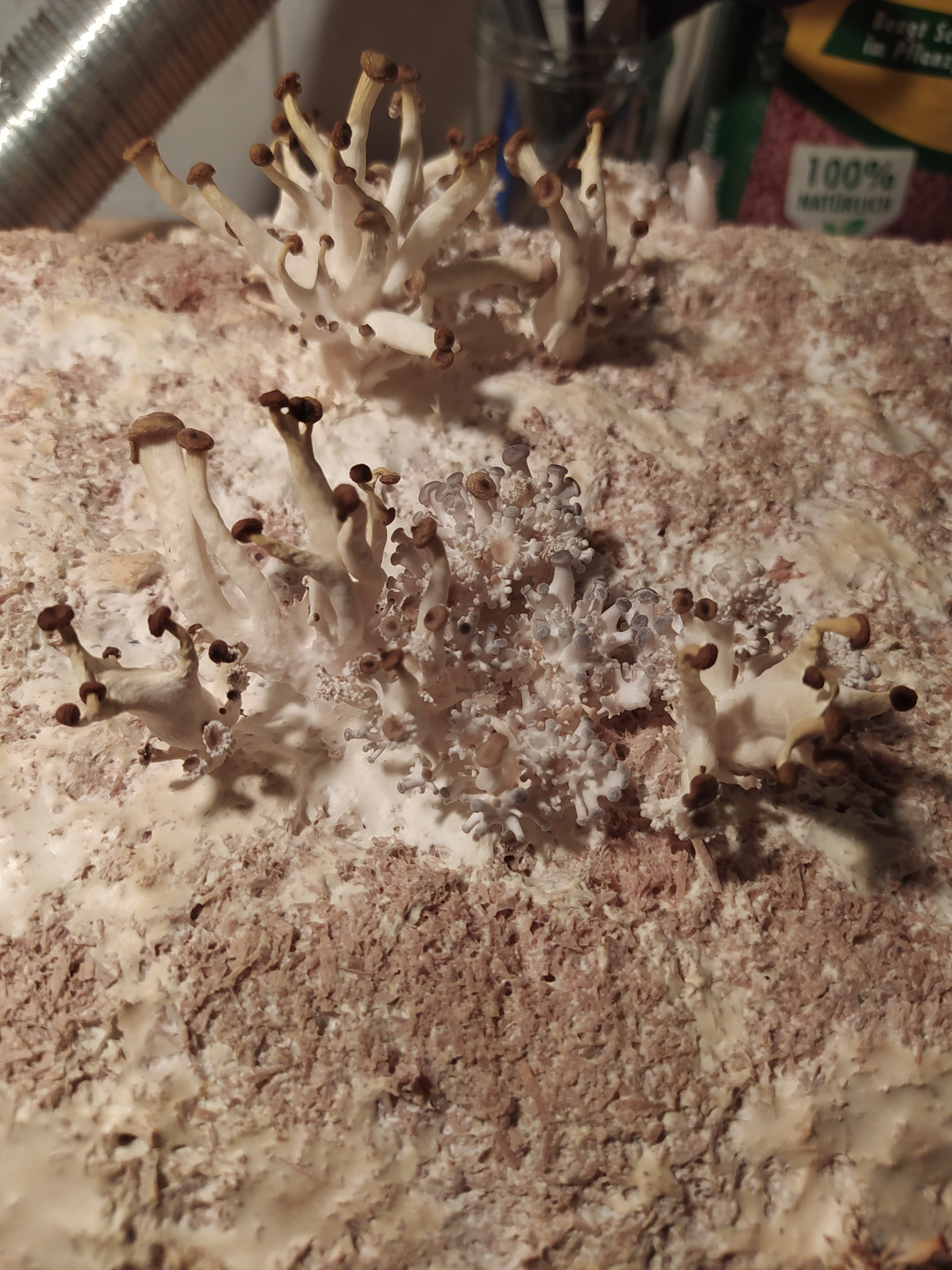 Die Pilzkörper sind wie getrocknen (ich habe sie überflüssig gewässert mit ein Sprühflasche), die wachsen seit etwa 3 Tagen nicht mehr, im Gegenteil, die sind kleiner geworden und teilweise braun.