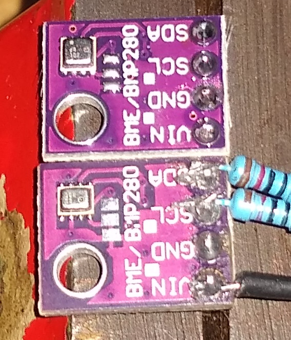 Ich hasse es, so'n Minikram zu löten. Ja Widerstände hab ich genug da. Hab ich eingelötet, wie vorgeschlagen.Ich würde mal zwei extern Pullup-Widerstände versuchen, wenn du zwischen den I2C-Pins und Vcc 10kOhm misst dann würde ich nochmal je 10kOhm von SDA und SCL auf 3,3V legen. Dann hast du 10kOhm parallel zu den bereits vorhandenen 10kOhm was 5kOhm ergibt. Hast du zwei 10kOhm Widerstände da?