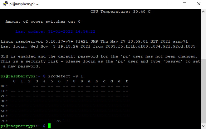 Mit Terrariumpi. Getestet wie vorher mit dem Befehl i2cdetect -y 1Mit welcher Software willst du den I2C-Bus auslesen? Oder experimentierst du aktuell nur mit den i2c-tools?