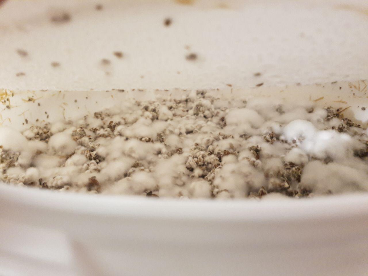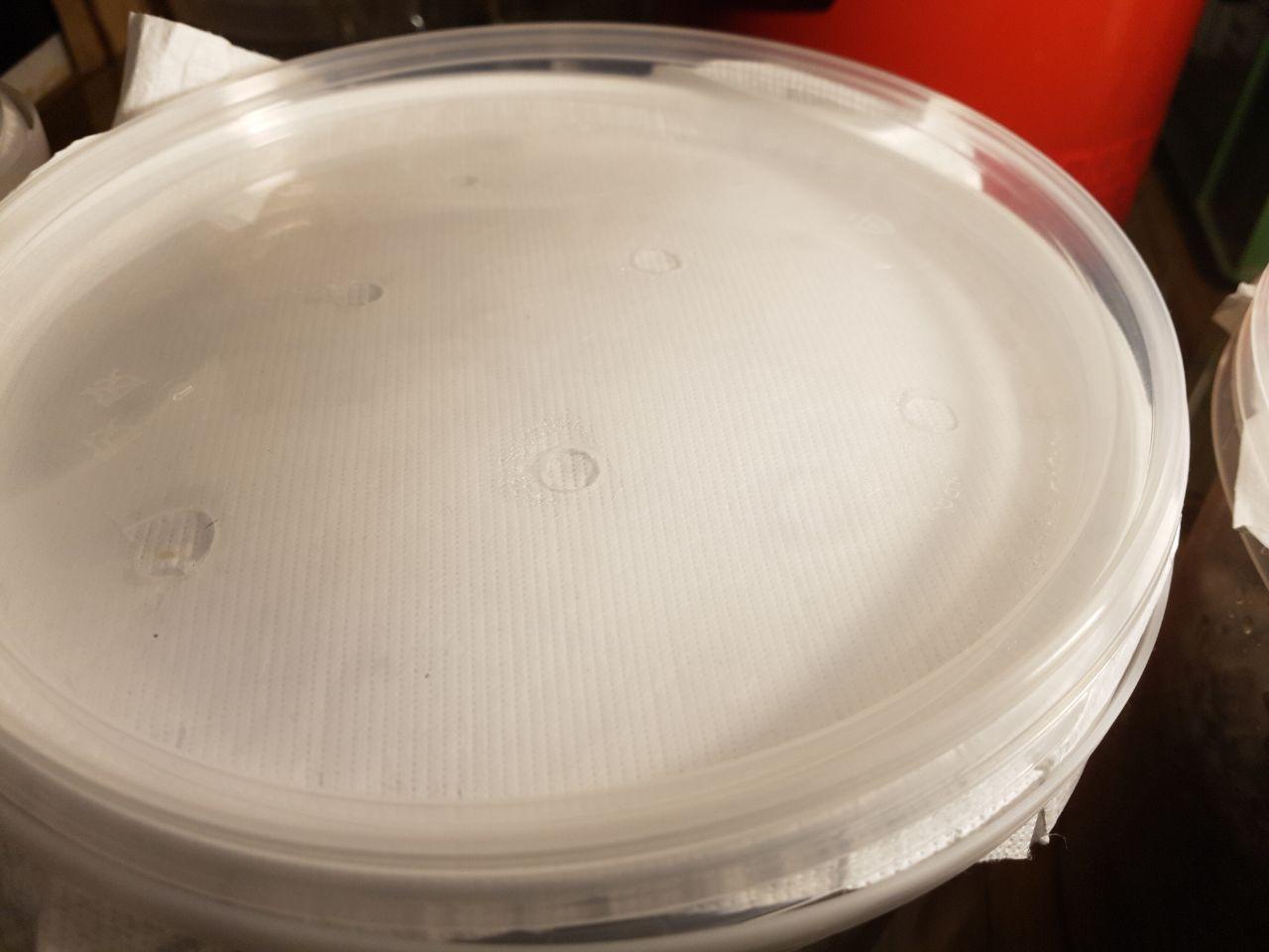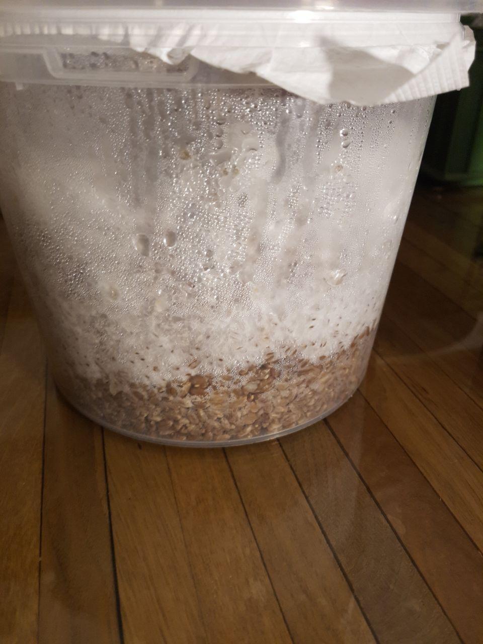 Einen Teil der Körnerbrut habe ich genutzt, um daraus in 3l-Eimern mehr Körnerbrut zu ziehen und damit die Eimer zu testen, die ich für sterile Ansätze vorgesehen habe. Die gekochten Roggenkörner scheinen eine gute Feuchtigkeit zu haben. Kondenswasser an den Rändern aber keins auf dem Boden. Und auch das Sterilisieren sollte in der dritten Version des DDKT nun hoffentlich funktioniert haben. Die Deckel der Eimer haben zur Belüfung Löcher bekommen. Unter dem Deckel klemmt auf ganzer Fläche Tyvek-Gewebe. Bisher habe ich nicht den Eindruck, dass das Substrat dadurch schnell austrocknet, allerdings ist die Lösung wohl aus einem anderen Grund suboptimal: dadurch dass das Tyvek den Deckel berührt, hält sich darunter Feuchtigkeit aus dem Sterilisationsprozess. Das behindert zum einen den Luftaustausch und könnte vermutlich auch den Stoff in seiner Funktion beeinträchtigen. Zudem sind die nach oben gerichteten Löcher Einfallstor für hinabschwebende Keime. Aktuell liegt ein weiterer Deckel ohne Löcher locker darüber. Die zweite Version der Eimer wird aber wohl etwas anders aussehen.