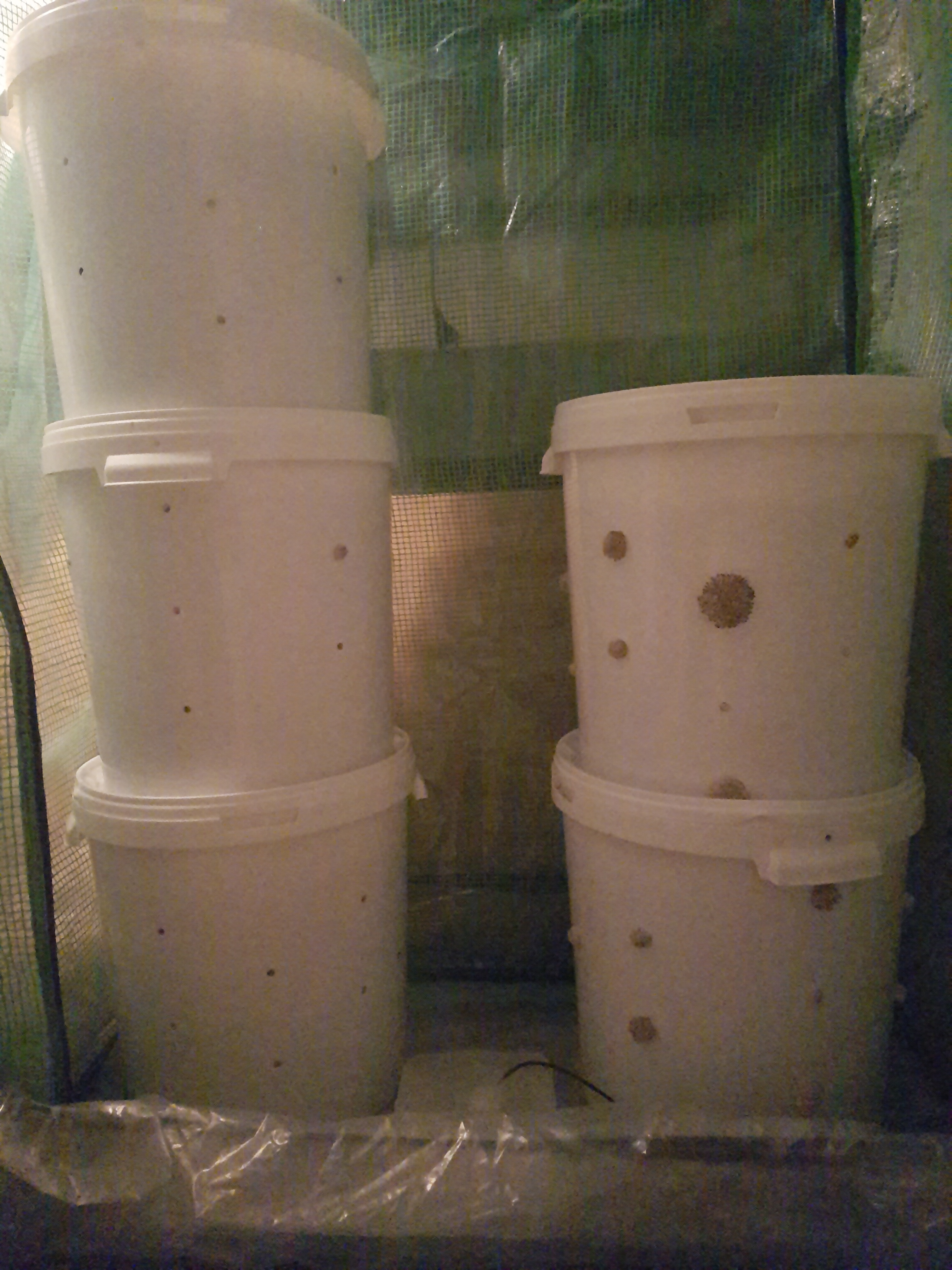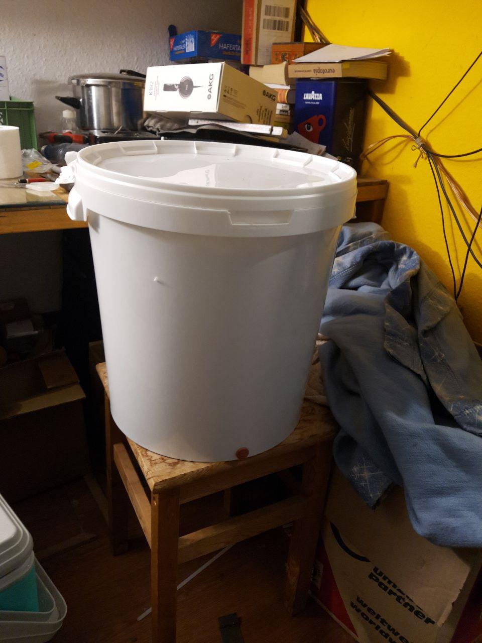 Zudem habe ich noch etwas zu viel Feuchtigkeit im Eimer, die ich nach und nach über einen Stopfen am unteren Rand ablasse. Auch vermute ich, dass das Material stärker verdichtet gehört.
