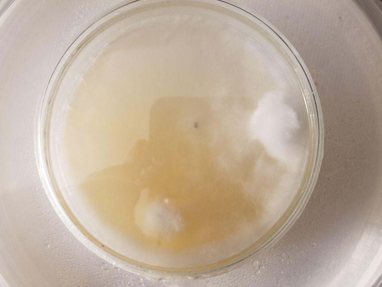 Mein Eindruck ist, dass beim Sterilisieren zu viel Wasserdampf in die Petrischalen eindringt. Auf den Bildern weiter unten ist viel Kondenswasser zu sehen. Zudem tue ich mir schwer damit, dass ich keine richtig sterile Arbeitsumgebung herstellen kann. Ich arbeite unter einer Art Haube, die ich auf eine Glasplatte stelle, als improvisierte ImpfBox. Die wird ausgenebelt und desinfiziert aber der begrenzte Platz und das Gefummel unter der Haube wirken noch ziemlich unbeholfen.
