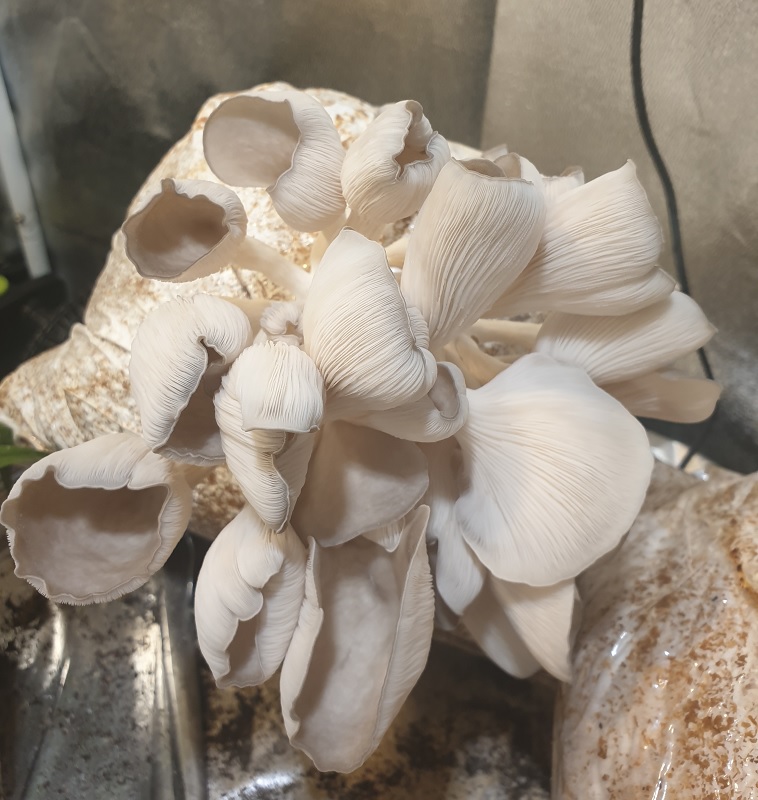 Ich würde Austernpilze immer früh ernten, bevor die sporulieren, also bevor die Kappen sich hochbiegen. Die werfen viele Sporen ab und das ist nicht gesund, die einzuatmen.