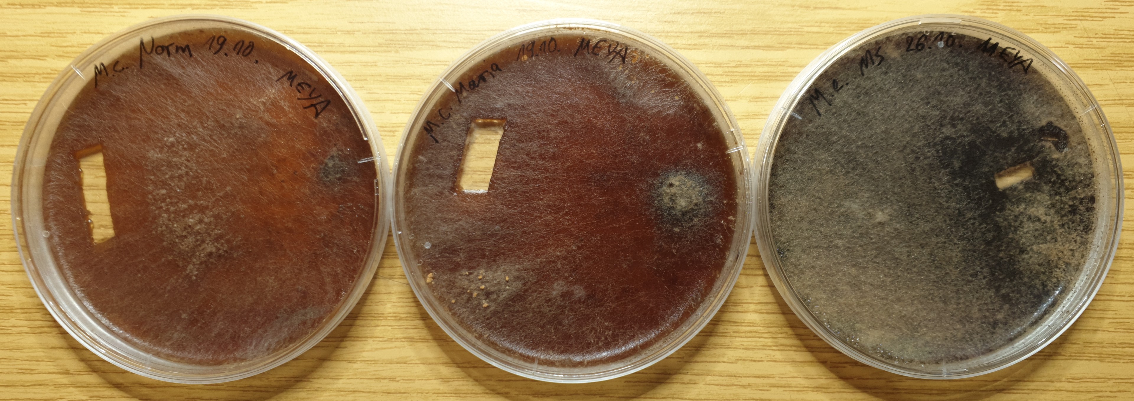 Im Rennen sind drei Myzelien, Norms Spitzmorchel, Marias Rindenmulch-Spitzmorchel und eine Speisemorchel. Die Speisemorchel hatte ich vor Jahren selbst gefunden, von den anderen hatte mir Maria netterweise Proben geschickt, zusätzlich auch von Norms "Speisemorchel" (die ich eher für eine der vielen Spitzmorchelarten halte), aber da wollte nichts wachsen. Von allen hatte ich kleine Stücke von getrockeneten Fruchtkörpern auf Agar gebracht (MEA mit Bierhefe und koffeinfreiem Kaffee). Nach wenigen Tagen wuchs Myzel, aber ich war einige Tage lang sehr skeptisch, da immer wieder einzelne Hyphen nach oben wuchsen und sich auf dem Weg zum Deckel verzweigten wie ein Köpfchenschimmel. Glücklicherweise bildeten sich keine weißen oder schwarzen Köpfchen, stattdessen erschienen bei den beiden Spitzmorcheln irgendwann Sklerotien, zuerst im, später auch auf dem Agar. Die Speisemorchel hat bis heute keine Sklerotien auf Agar gebildet, was ich auf die Nährstoffmischung schiebe.
