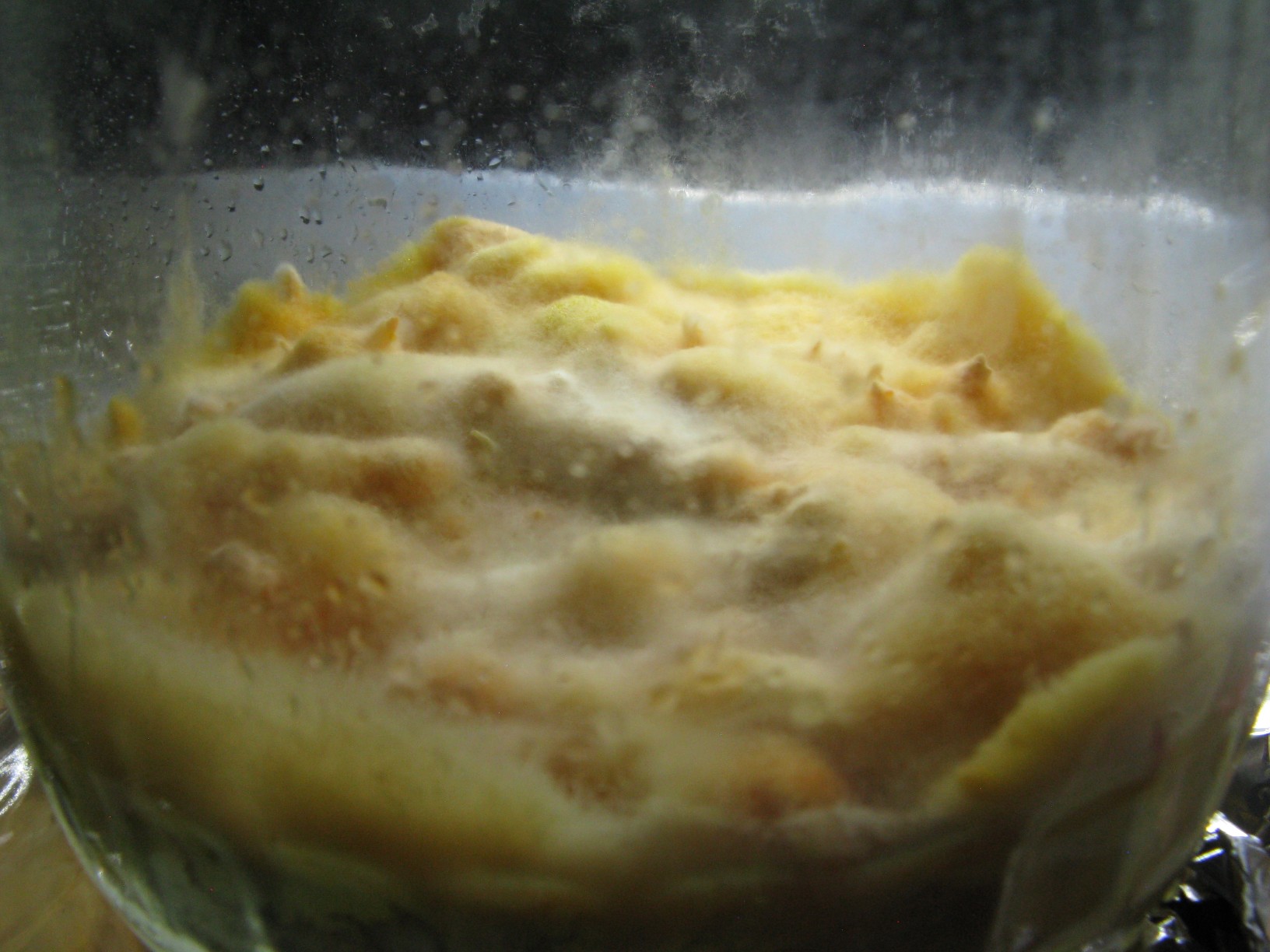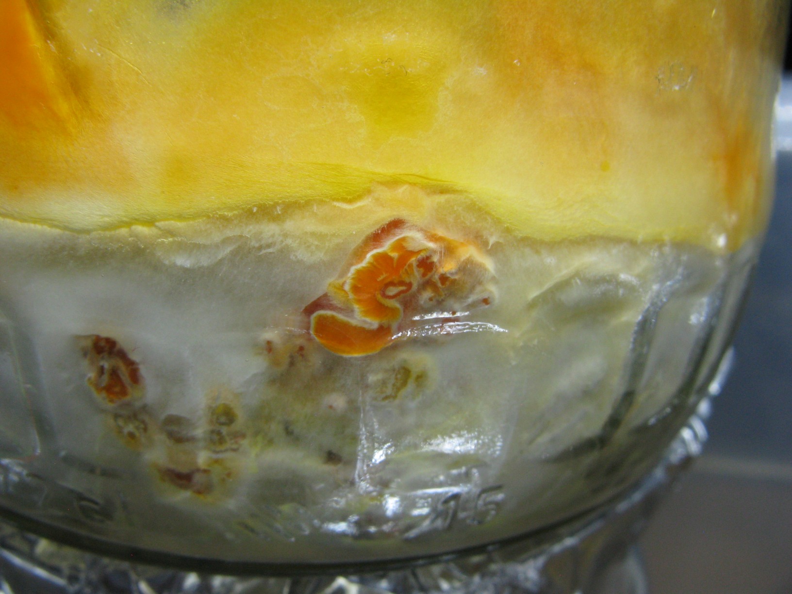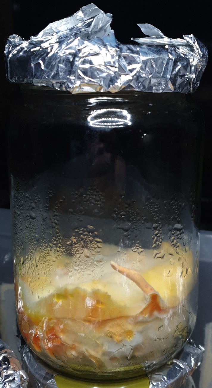 Leider hatte ich nicht gründlich genug recherchiert und alles viel zu lange im recht dunklen Regal durchwachsen lassen, bis ringsum ein dichter Myzelpelz vorhanden war und sich die ersten Stellen orangerot verfärbten. Ich hätte auch besser zuerst mehr LC hergestellt und jedes Glas mit 10ml beimpft.