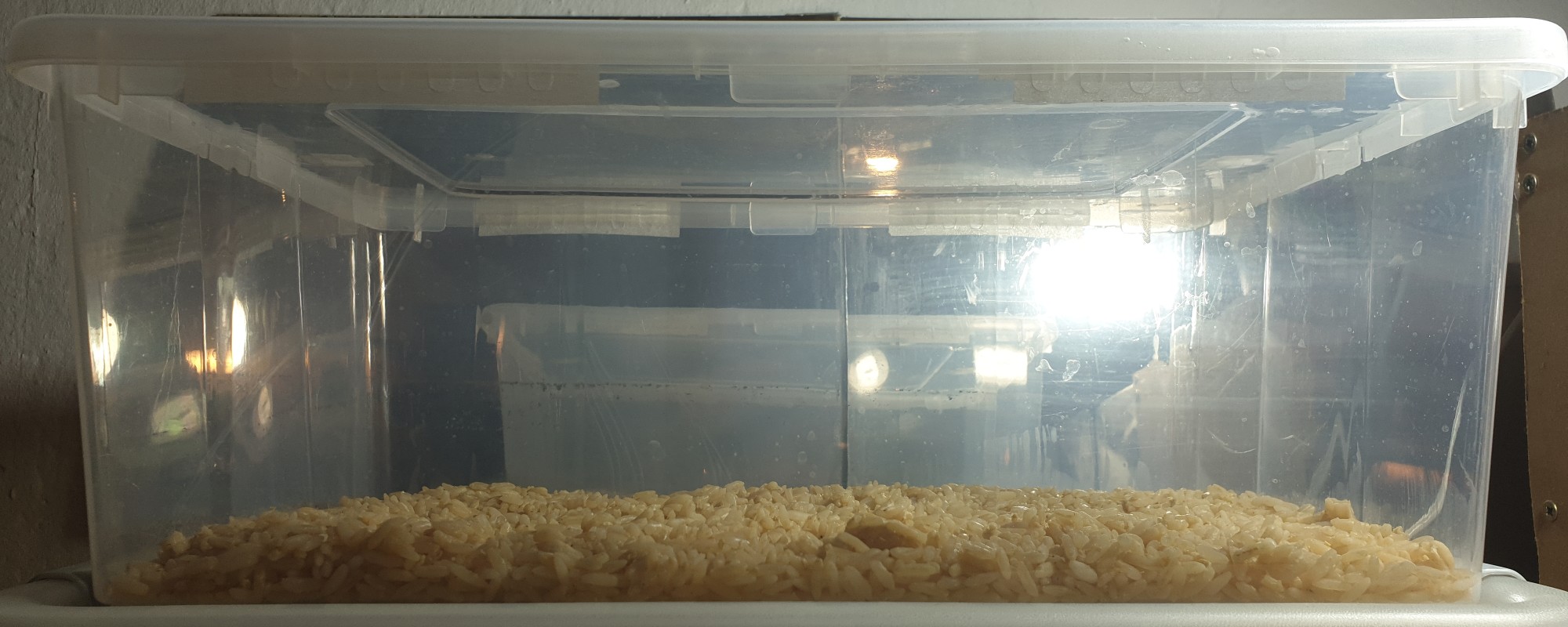In einer anderen Schale hatte ich zwei weitere an den Deckel geklebt, so dass sie den Agar zwar nicht berührten, aber Sporen abwerfen konnten. Mit Vaseline ließen sich die beiden recht einfach befestigen. Seltsamerweise hat das Pilzstück im Vordergrund entweder keine oder keine keimfähigen Sporen produziert. Das andere hinten rechts dafür umso mehr.