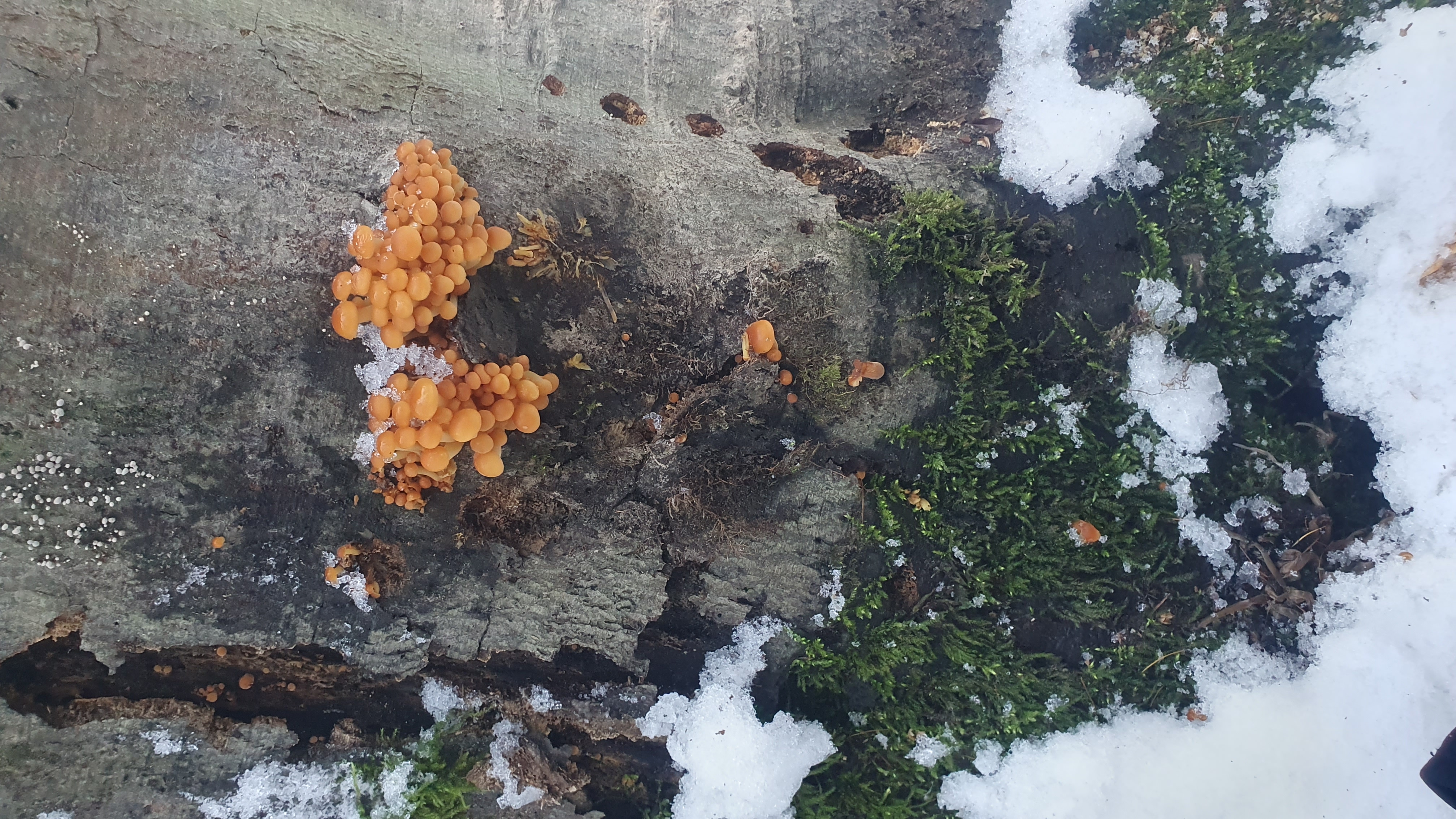 Pünktlich Anfang Dezember kommen die ersten Gemeinen. Samtfußrüblinge (Flammulina velutipes) an meiner Lieblingsstelle, einer abgestorbenen Buche, welche jedes Jahr außergewöhnlich gut Trägt und sehr große Fruchtungen hervorbringt. Jedoch ist der Buchenwälder bzw. unsere Buchenforste keine idealen Standorte für Samtfußrüblinge da es meist zu wenig Titholz gibt und an dem vorhandenen meist andere Arten wie diverse Vertreter der Porlinge, Trameten, Schichtpilze, unsere Austernseitlinge und viele weitere Arten dominieren. Wesentlich erfolgreicher und mehr Stellen auf kleinerem Raum finde ich in Bruchwäldern, Auen, im Parkartigen Gelände (Heckensysteme und ähnliches), hier kann ich ganz vorne mit dabei die Weide nennen aber auch andere Laubgehölze sind gute Fundstellen. Allerdings sollte man den Verwechslungspartner Gifthäubling (Galerina marginata - potenziell tödlich giftig) kennen und sicher bestimmen können, diesen habe ich ein paar Seiten vorher schonmal gepostet.