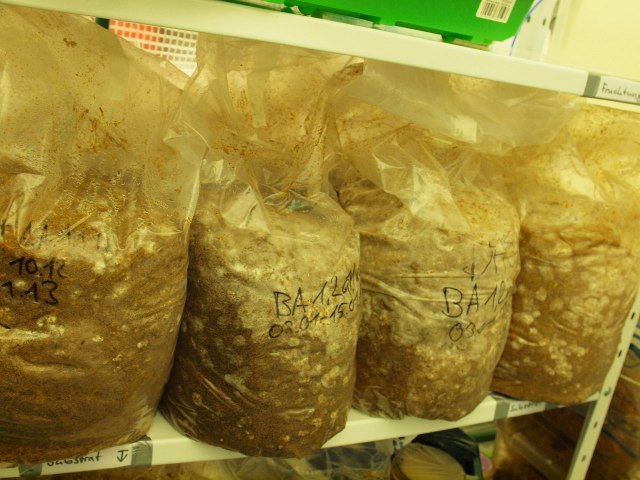 Die einige der abgebildeten Beutel sind in die Fruchtungskammer umgezogen. Gleichzeitig sind weit ueber zwanzig andere Hinzugekommen mit den verschiedensten anderen Pilzen (Reishi, Volvariella Bombycina, Reishi, Trametes Versicolor).
