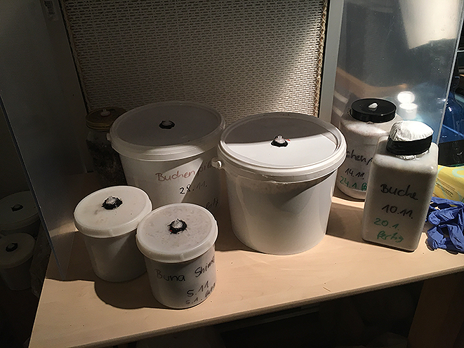 Ich lasse die Substratsäcke und die Eimer am Anfang in der warmen Wohnung zum schneller durchwachsen und dann ab in den Keller.