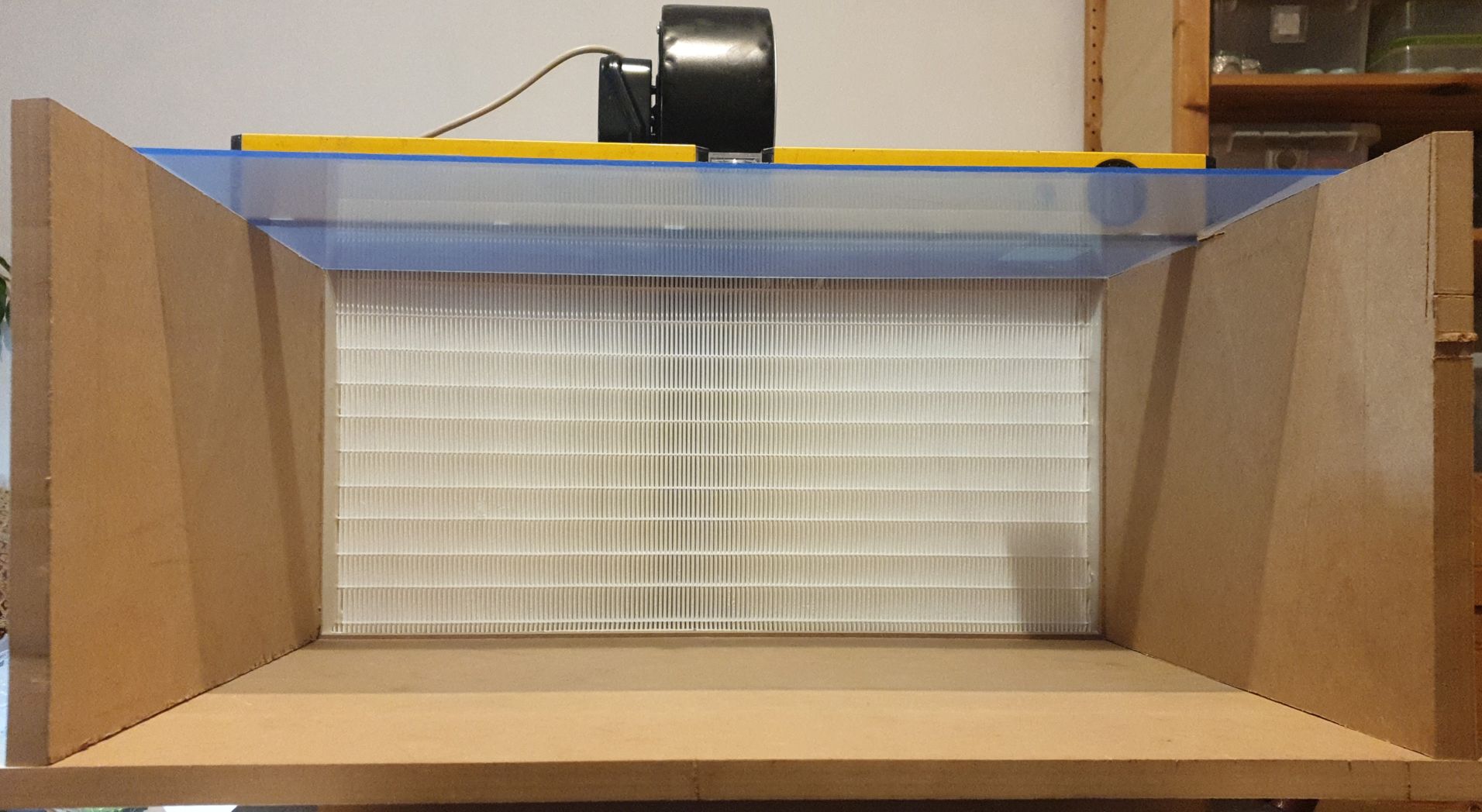 Dass das Plexiglas nicht ganz bis nach vorne reicht, muss leider so sein, sonst würde es heruntergeklappt über den unteren Rand der Kiste hinausragen. Die Seitenwände sind mit jeweils zwei dünnen Holzdübeln am Filtergehäuse und einem an der Bodenplatte locker angesteckt, so dass der Vorbau zerlegbar ist. Die Seitenteile sollen noch durch genauer gesägte Stücke ersetzt werden, aber bei einem Räucherstäbchen-Test zeigte sich trotz der Lücken eine gleichmäßige laminare Strömung.