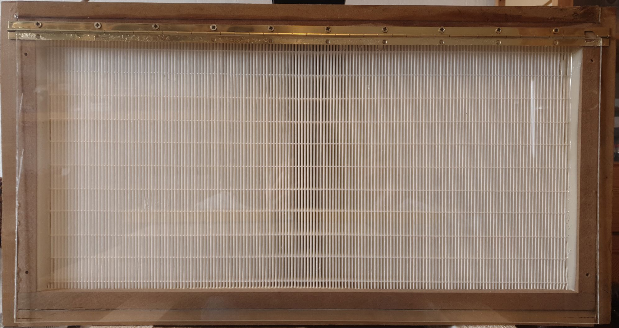 Bei Benutzung musste ich neulich leider feststellen, dass sich 3mm dickes Plexiglas ganz schön durchbiegt, wenn es nur an den Seiten aufliegt. Am Filter wird es jetzt durch das Scharnier stabilisiert und für die Vorderseite habe ich noch ein Aluminium-U-Profil bestellt.