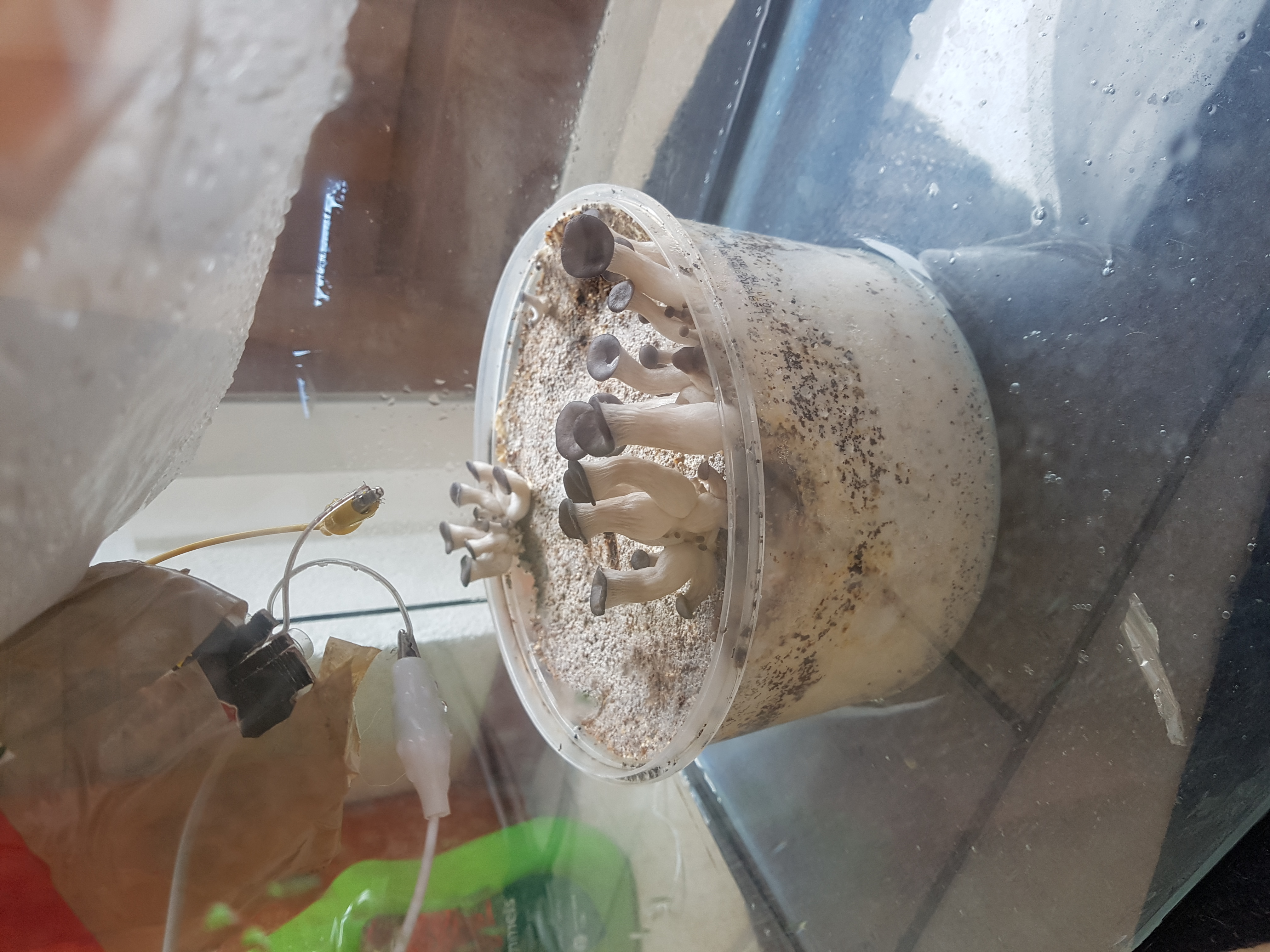 gebastelt und das ganze direkt über den Pilzen im Aquarium positioniert. Wenn ich das anschalte sollte es eigentlich alles einschliesslich CO2 von der kultir absaugen und frische Luft von hinten nachströmen wo ich das Fenster auf mache. Die Luftfeuchte geht schon mal rasant runter wenn ich das anschalte also hoffe ich mal das Co2 geht mit raus. Wie oft sollte ich das denn machen? Das Aquarium hat 60L.