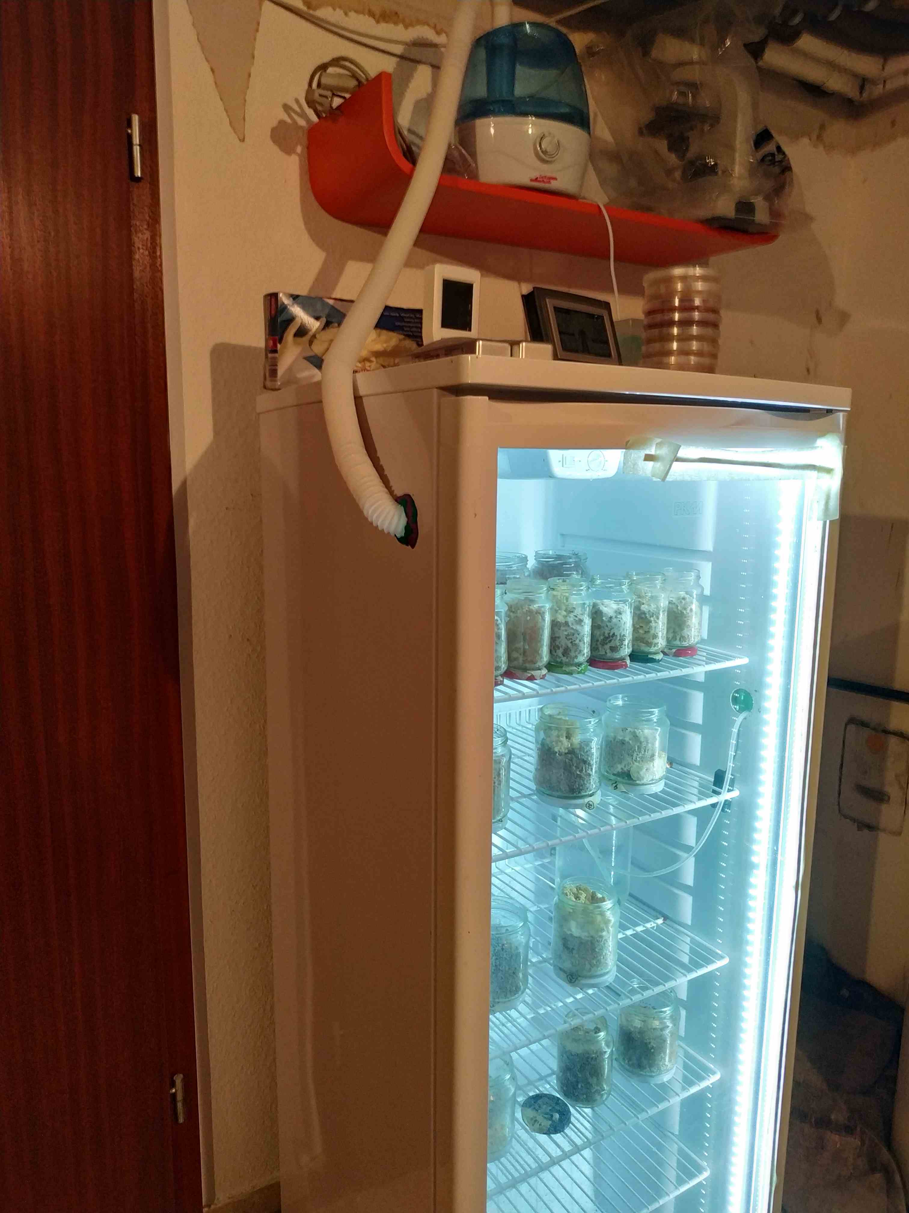 Ein Loch dient dazu alle Fühler und ggf. zusätzlich Kabel in den Kühlschrank zu bekommen, durch das zweite Loch wird Nebel eingeleitet, um die gewünschte Luftfeuchtigkeit einzustellen. Abgedichtet werden beide Löcher durch Kinderknete => so ist man flexibel und kann jederzeit Änderungen vornehmen. Wie bereits geschrieben wird CO2 nicht geregelt, aber bisher hat das bei meinen Ansätzen kein Problem dargestellt. Für Seitlinge (außer KS) allerdings unbrauchbar, da selbst die Kellerluft außerhalb des Kühlschranks eine zu hohe CO2 Konzentration aufweist...