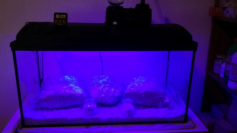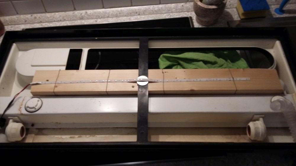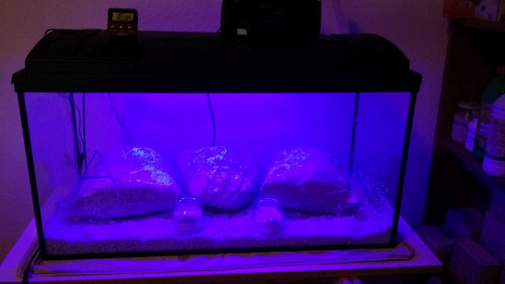 So wir haben jetzt ca 50 cm LED Band (SMD 3528 blue) auf ein Brett am Aquariendeckel geklebt und mit Draht befestigt. Das sind also ca 30 Module a 6 Lumen, macht zusammen 180 Lumen. Die Dioden haben einen Abstrahlwinkel von 120°, leuchten also den Boden gut aus (natürlich nicht 100% gleichmäßig). Das Aquarium hat die Maße 80L x 35T x 40H cm^3, also eine Grundfläche von 0,28 m^2. Sind also etwas mehr als 640 Lux an der am stärksten beleuchteten Stelle (irgendwo in der Mitte) und damit überdimensioniert (wir haben das LED-Band ja eigentlich für das Foliengewächshaus, das eine größere Grundfläche hat, gekauft). Mal schauen ob es dennoch klappt. Wir haben jetzt vorerst auf 12/12-Tag/Nacht-Zyklus eingestellt. Am Wochenende bekomme ich ein Luxmeter ausgeliehen, dann messe ich das nochmal nach.