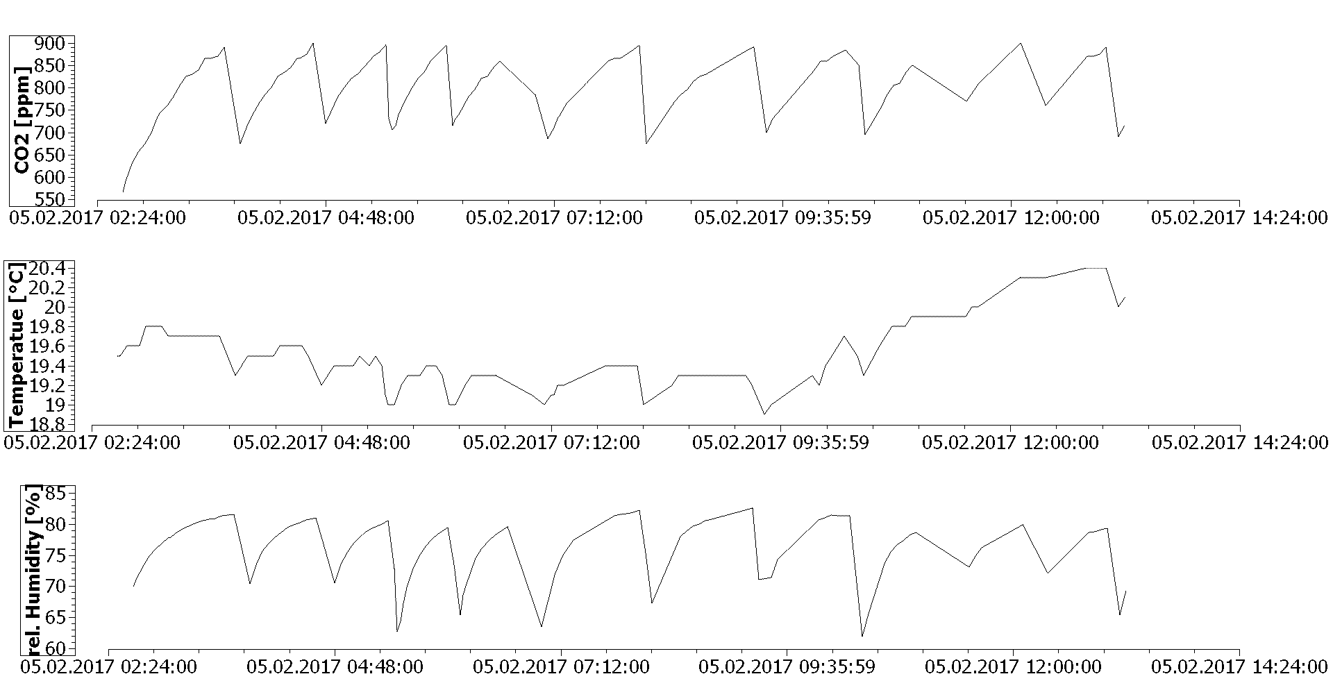 Hier Temperatur und Luftfeuchtigkeit: Und hier CO2: Es fehlt auch noch, welches Gerät wann ein- bzw ausgeschaltet war (Lüfter, Heizung etc). Kommt alles noch.