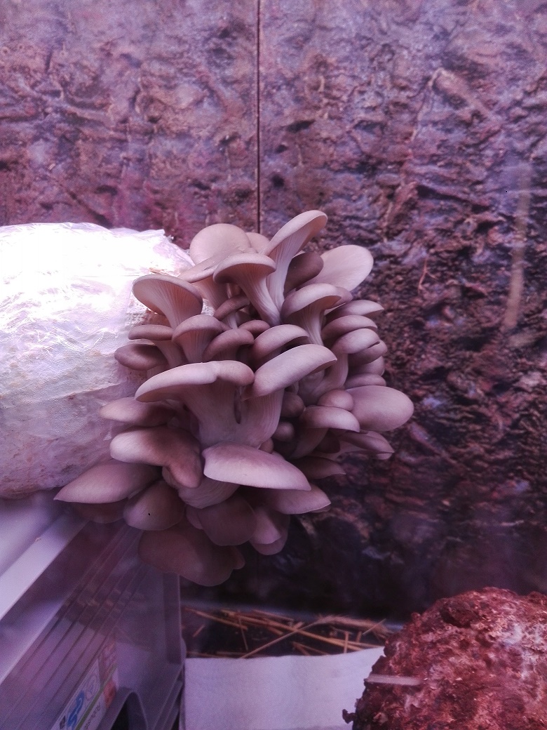 Hier sind ein paar Fotos von meiner Auster auf dem Substrat mit den Zutaten von Holzpellets, Strohpellets, Kleie, Buchenchips und Kalk sowie Gips.