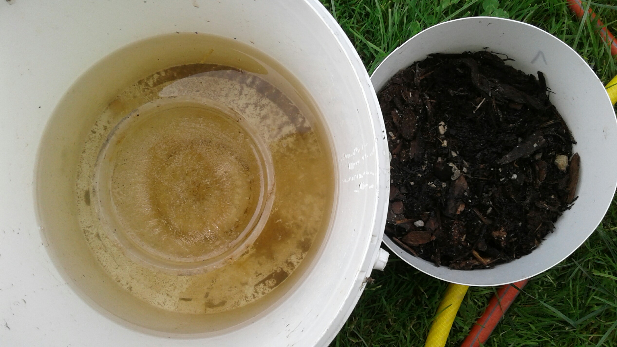 Und dann noch was: ich hatte ja ein paar Tröge hergerichtet und ein paar Sklerotien platziert. Die Tröge habe ich dann in einen Eimer auf einen blumentopf gestellt und unter einen manchmal tropfenden Wasserhahn stehengelassen.. ich musste jetzt Platz machen. Und als ich den Trog aus dem Kübel hebe ... Was wächst da auf dem WASSER!!?!