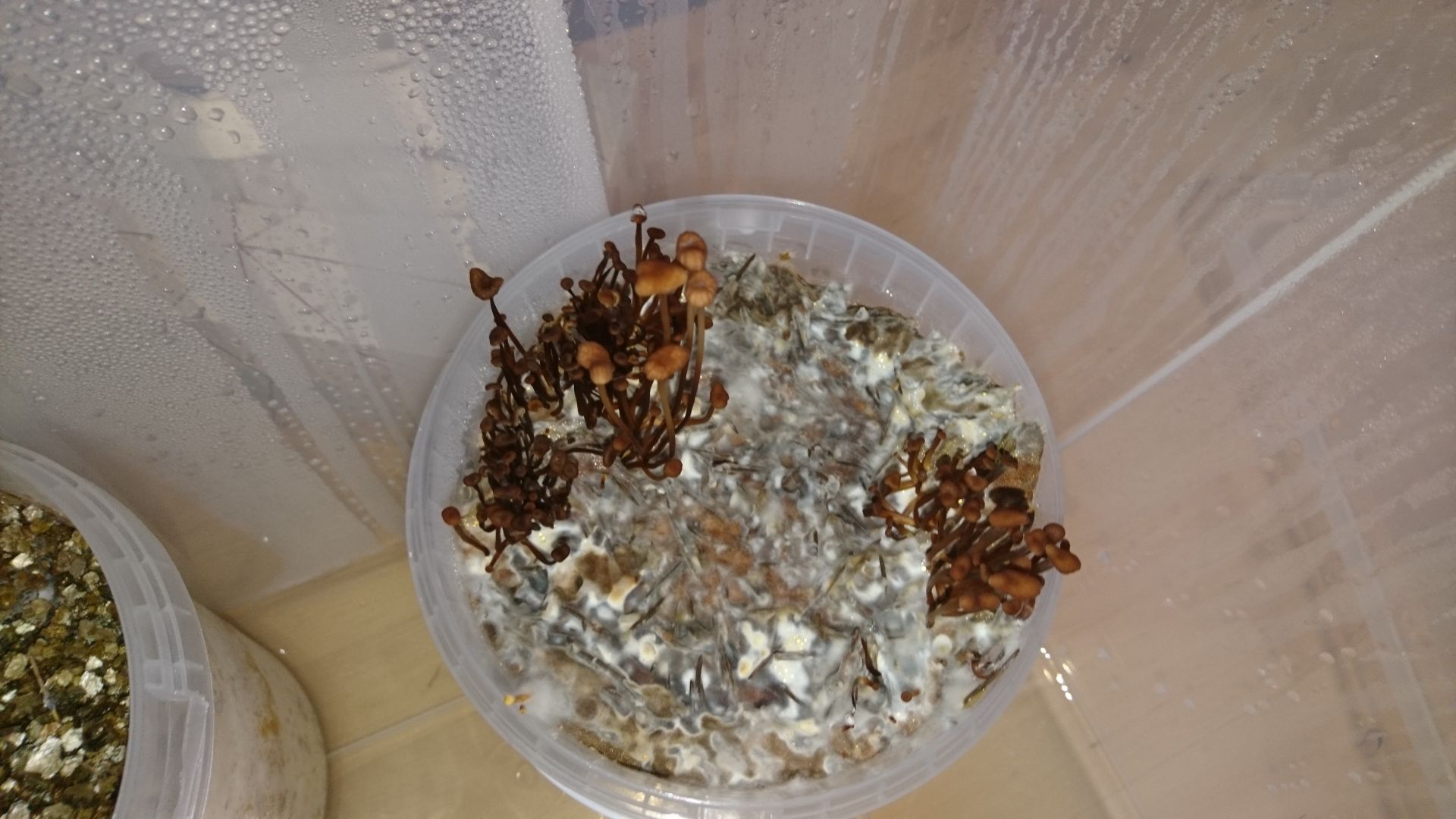 Habe festgestellt, dass obwohl die Luftfeucht so hoch ist, dass die Pilzchen teils matschig waren, das Myzel selbst sehr trocken war.