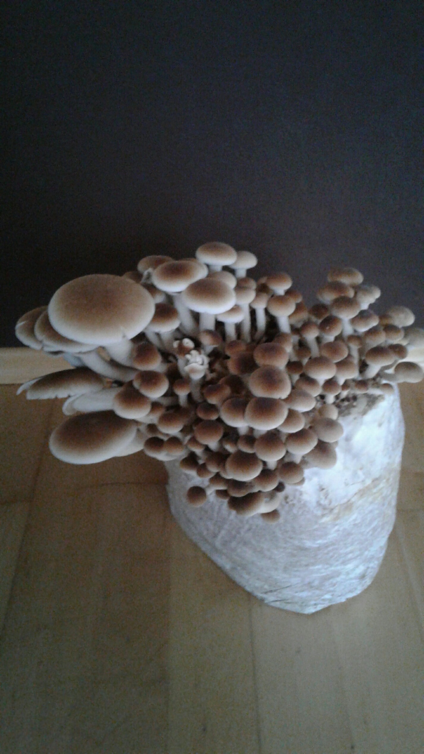Der Testsack fruchtet momentan. Nicht viele primos. Einerseits sind wohl die Bakterien Schuld andererseits sind meine Fruchtungsbedingungen (momentan am Fensterbrett mit Sprühflasche) suboptimal. Anbei ein Foto von einem der ersten beiden Blöcke um die ich mich fürsorglich gekümmert habe.