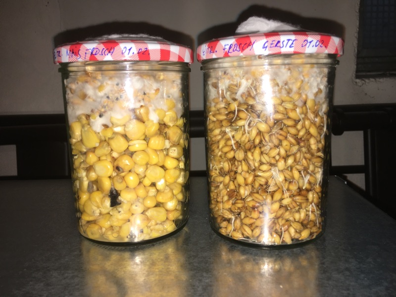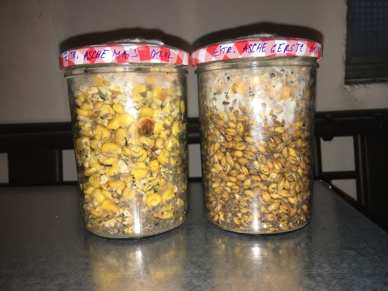 Kleines Update ohne Fotos. Scheint so zu sein, das auch im Waschmittelglas und Aschenlaugenglas mit Mais sich Schimmel gebildet hat. Und es ist irgendwie überall der selbe Schimmel, weiße etwas rare Myzelfäden mit schwarzen Knötchen (Sporangien?). Dieser Schimmel tritt immer nur beim Mais auf. Das habe ich hier schon berichtet, sogar beim Mais, welches ich gären ließ, ist auf dem Gärungsschaum dieser Schimmel aufgetretten. Kann das sein, dass der Futtermais von vornherein mit diesem Schimmelpilz kontaminiert ist? Jedenfalls scheint es so zu sein, dass die Sporen extrem wiederstandsfähig sind.