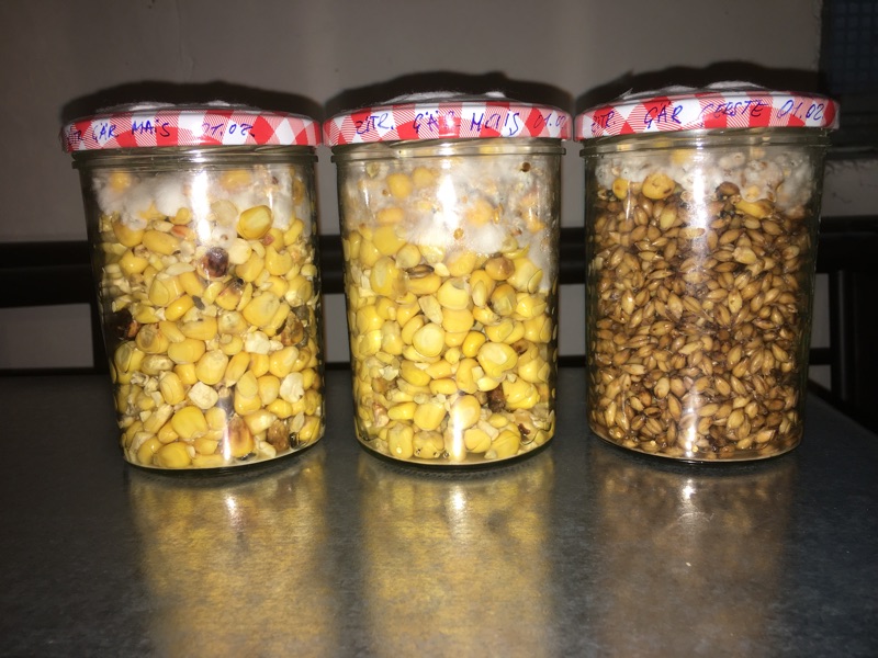 Kleines Update bezüglich dem ersten Aschenglas mit Zitronenseitling: Die Maiskörner, die weiße Punkte gebildet haben, sind vom Myzel schon "geschluckt" worden. Mehr als 3/4 des Substrats sind jetzt durchwachsen. Allerdings hat sich die Wachstumsgeschwindigkeit verlangsamt - bestimmt wegen der Nässe unten. Ich habe deswegen vor ein paar Tagen Gerste zum Gären angesetzt, wenn die Gärung durch ist, werde ich das Myzel aus dem Aschenlaugenglas umsiedeln.