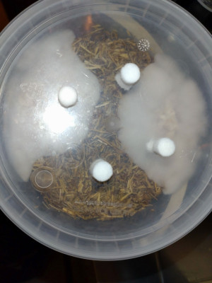 Dazu hab ich noch eine voll durchwachsene 1L Kultur die ich versuche zum Fruchten zu bringen, die sieht eigentlich sehr gesund aus und ist bisher scheinbar auch sehr schimmelresistent. Bei anderen Pilzen waren Kulturen die langsam wuchsen, bzw auf suboptimalen Substraten immer anfällig für Schimmel in nicht steriler Umgebung. Das scheint hier nicht der Fall zu sein.
