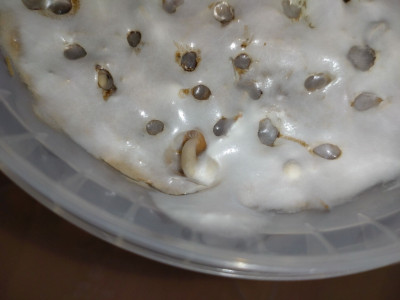 Ist ein Sterilansatz den ich im Juli beimpft habe, der zuerst über Wochen sehr langsam wuchs und dann irgendwann Fahrt aufnahm und schließlich doch durchgewachsen ist. Beimpft 10.07 - in der Fruchtbox seit 11.09