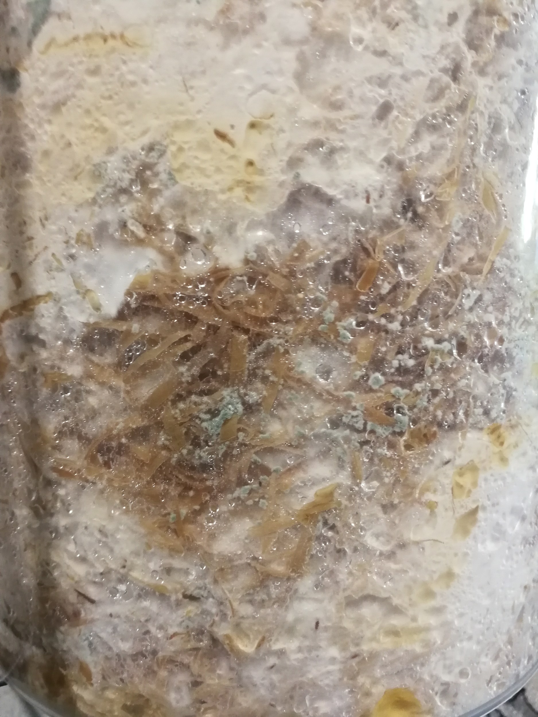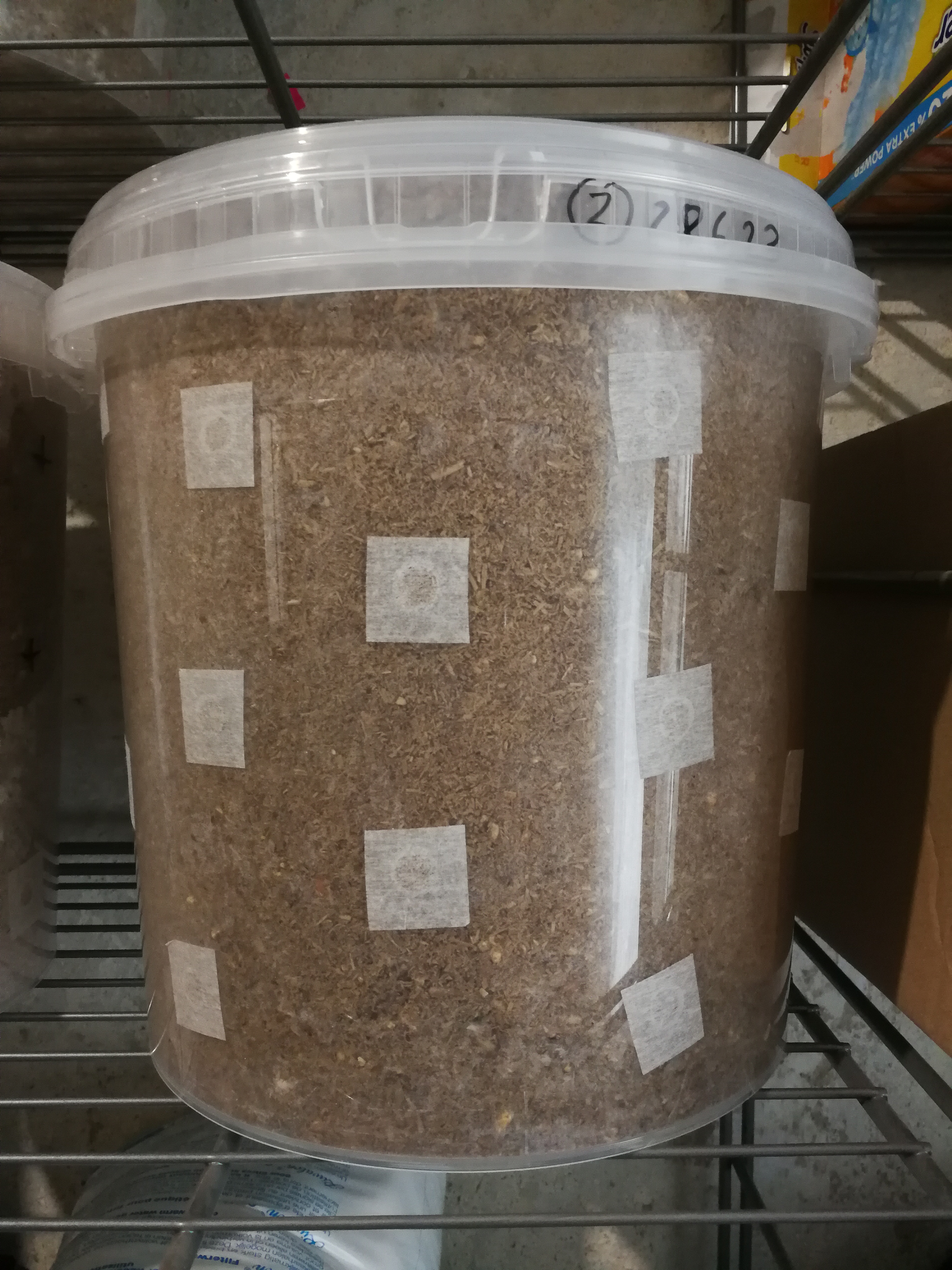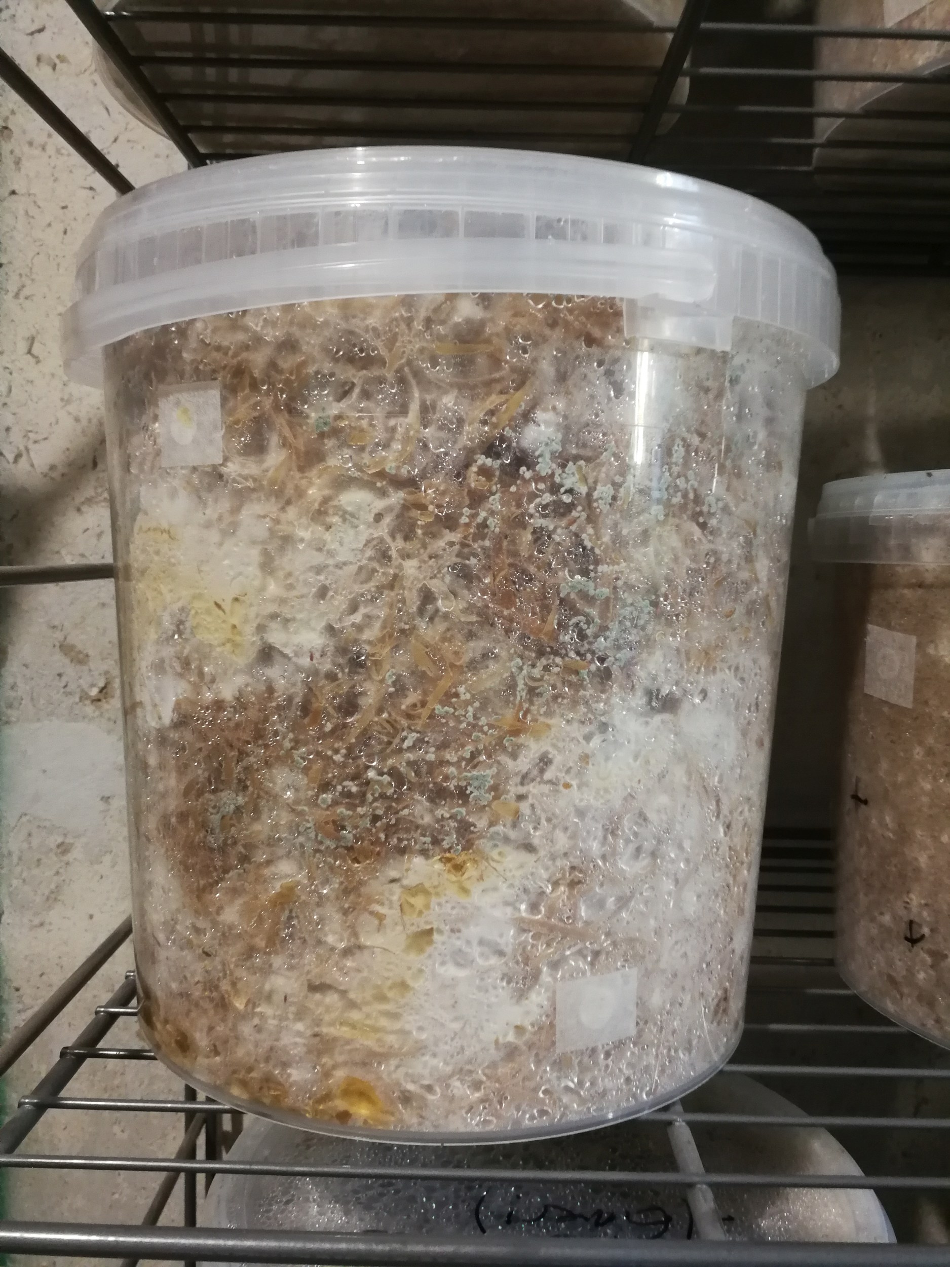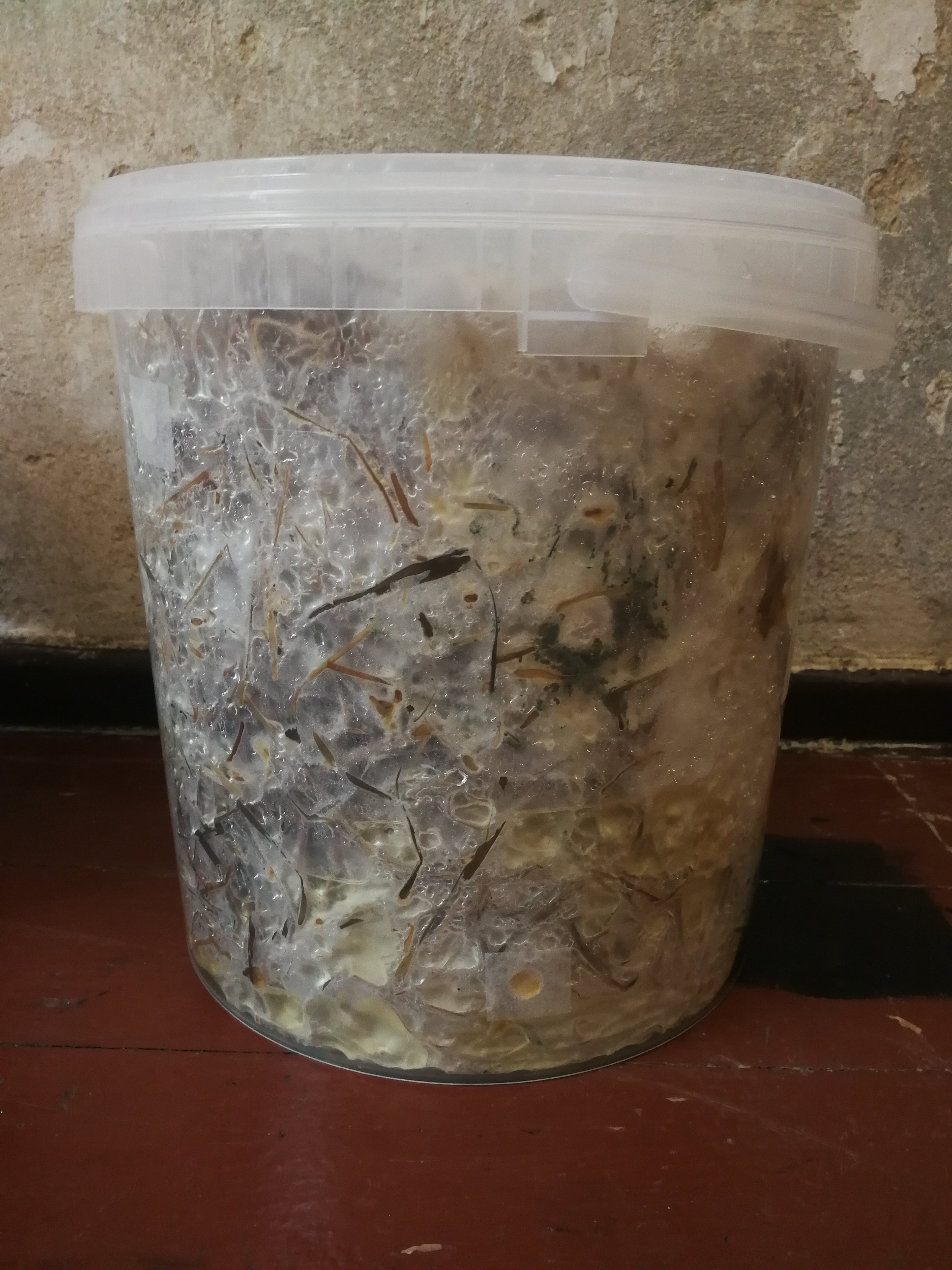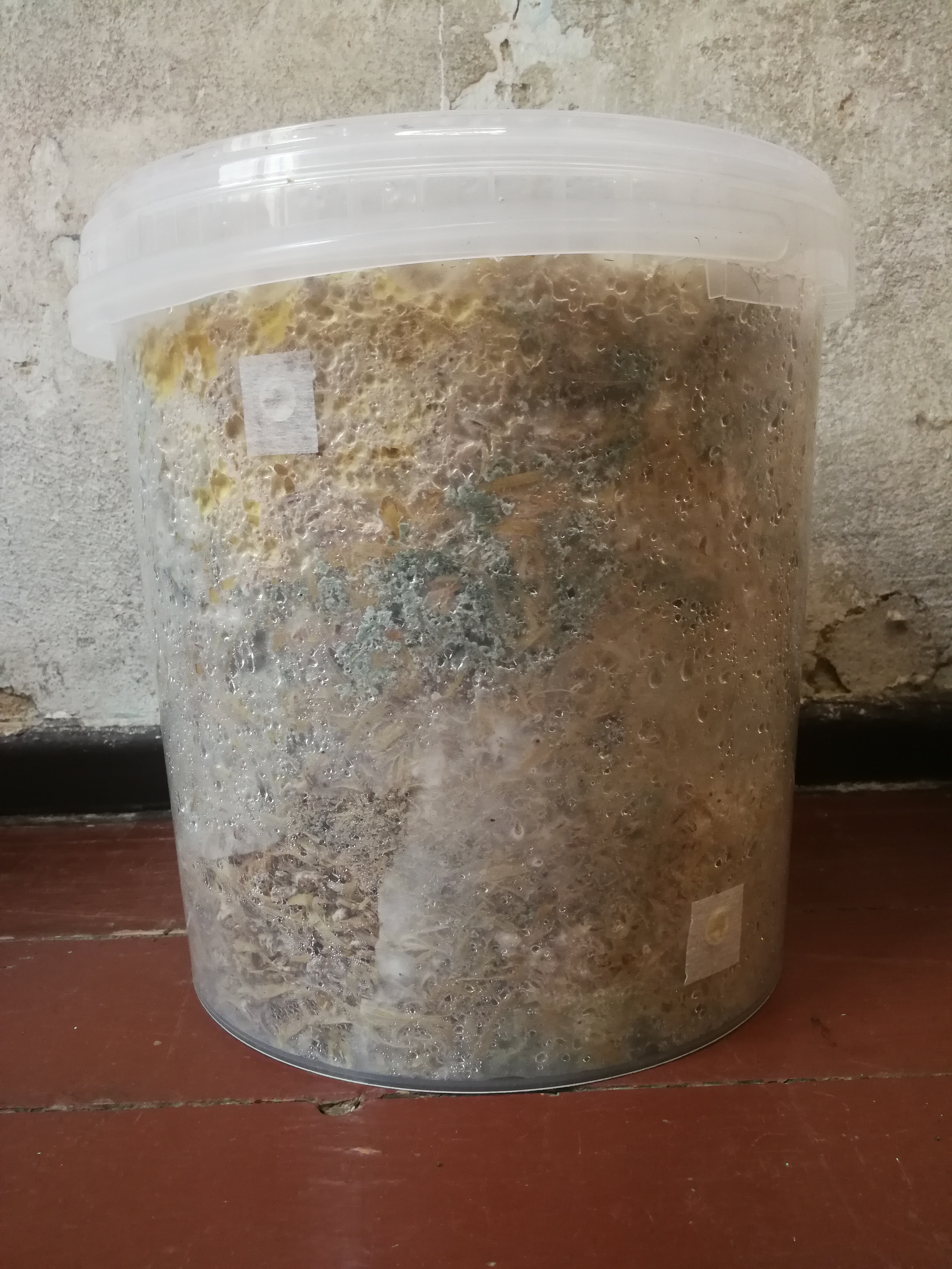 Die Eimer mit Stroh der letzten Charge haben Schimmel angesetzt (nach insgesamt 6 Wochen):