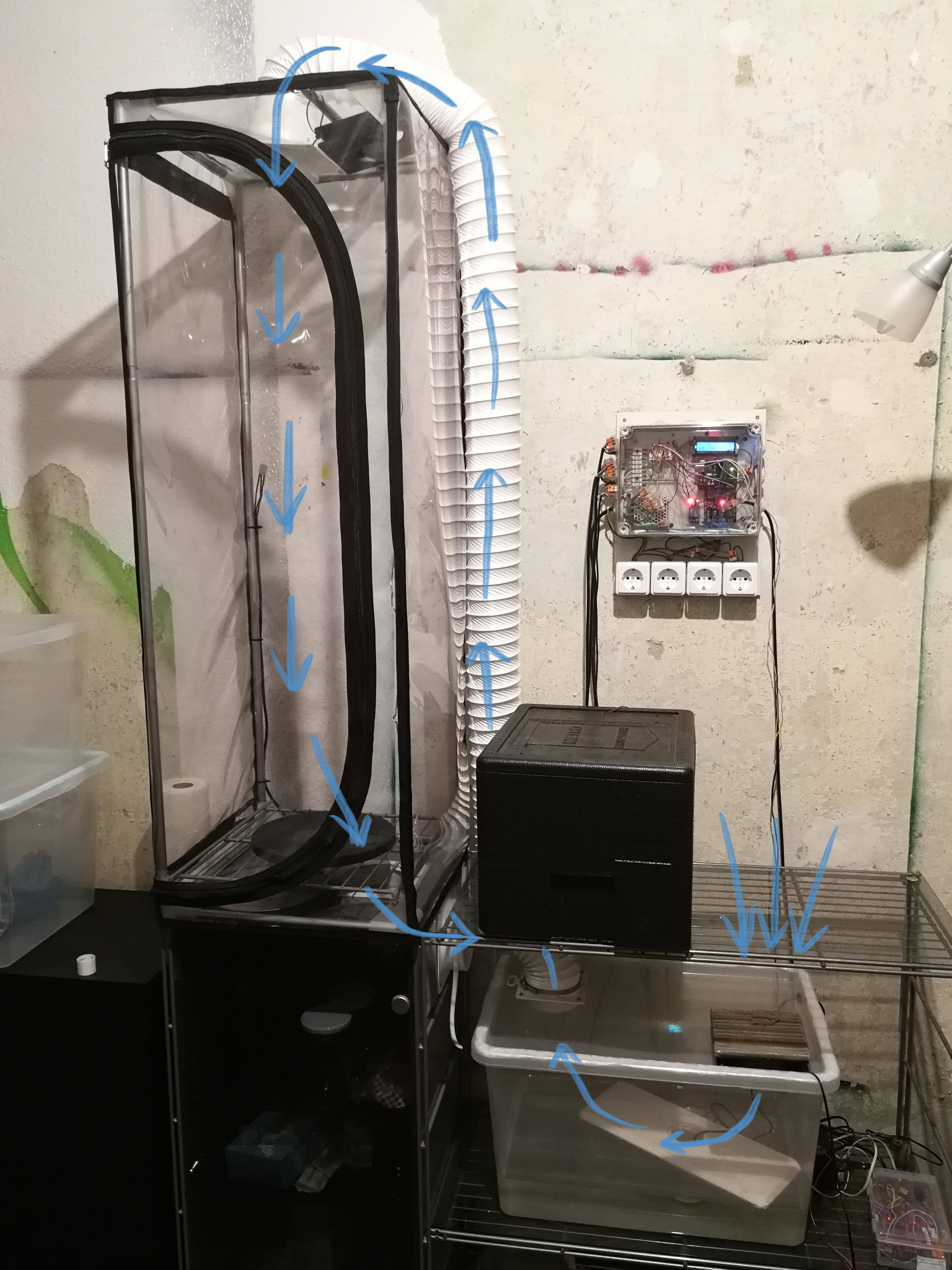 Alles indoor. Das Zelt wird mit einem Arctic P14 Lüfter belüftet. Ich habe den Luftstrom hier eingezeichnet: