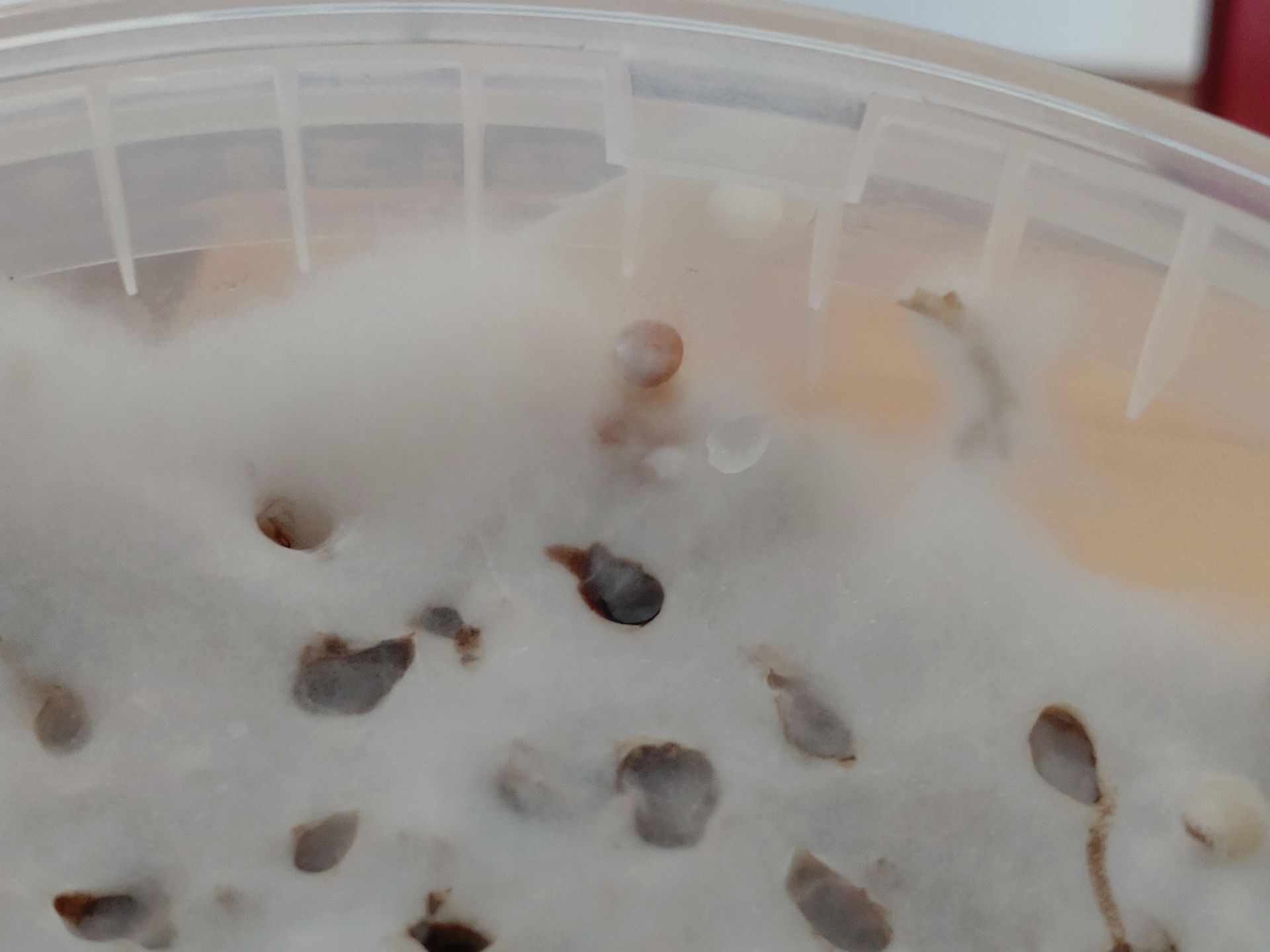 Meine Kultur in Wiesenerde ist ziemlich dünn bewachsen, da hast du nicht diese ausgeprägte Flaum/Mycel Bildung auf der Oberfläche. Bei dem Ansatz "simuliere" ich gerade Regen