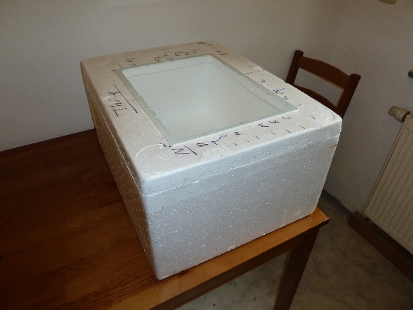 Die Styroporbox bekommst Du am einfachsten im Aquarienhandel (umsonst, nach netter Nachfrage.) In denen weden veschiedene Fische geliefert, für den Händler ist das Abfall.
