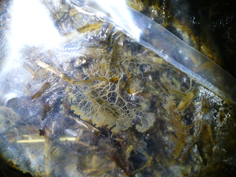 Zur weiteren Vorgehensweise bin ich ratlos. Vielleicht könnte man den von der Auster besiedelten Bereich herausnehmen, säubern, in einen kleineren Beutel übertragen und fruchten lassen, aber sobald da nur ein wenig vom Schleimpilz mitkommt, wird es bald wieder von vorne losgehen. Falls ein Garten zur Hand ist, würde ich das Austernmycel an einer feuchten und schattigen Stelle vergraben, mit ein paar cm Erde bedecken und den unbesiedelten Rest samt Schleimer auf dem Kompost entsorgen.