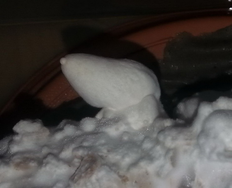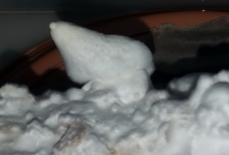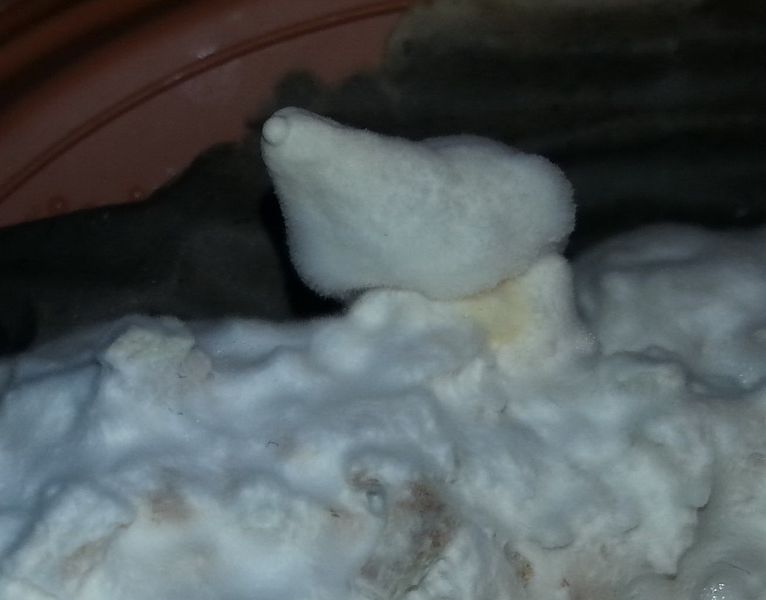 Am Boden der Kiste steht etwas Wasser, der Block liegt erhöht auf einem umgedrehten Plastik-Blumenuntersetzer und hat keinen direkten Kontakt zum Wasser. Nachdem ich ihn aus der Tüte genommen hatte wurde er erst noch "flauschiger", aber dann bildete sich auch eine kleine Primordie. Diese wuchs erst eigentlich ganz schön (soweit ich das als Anfänger beurteilen kann