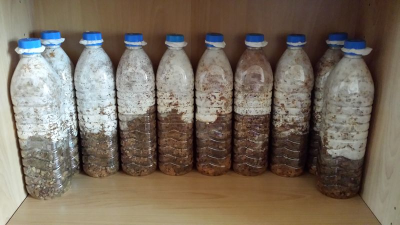 wie ihr weiter unten auf den Bildern sehen könnt habe ich mir eure Ratschläge bezüglich der Frischluft und der Helligkeit zu Herzen genommen und bin das Problem folgendermaßen angegangen: Da ich früher mal Zwergwarane gehalten habe, habe ich im Wohnzimmer noch 2 Terrarien stehen, wovon ich nun eins für die Pilze geräumt habe. Beleuchtung in Form von Neonröhren und UV-Strahlern war eh vorhanden und zusätzlich habe ich mir nun noch einen Ventilator in den Deckel eingebaut, der für die erforderliche Frischluft sorgt. Momentan sprühe ich zwar immer noch mit einer Pumpflasche, werde mir aber wohl einen Vernebler kaufen, den ich dann auch über eine Schaltuhr laufen lasse. Die Pilze haben zwar immer noch einen etwas längeren Stiel, aber die Hüte sehen meiner Meinung nach jetzt einigermaßen "normal" aus... Da mich jetzt der Ehrgeiz gepackt hat und ich noch etliches an Brut hatte, habe ich mir mal noch ein paar Fläschchen und Eimerchen beimpft... Hier mal noch ein paar Bilder: