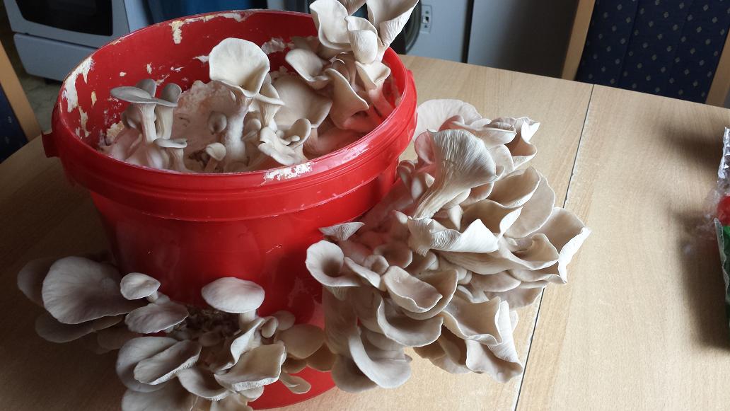 ich wollte mich mal wieder melden und euch über den Stand der Dinge berichten. Die Eimer bringen eifrig Austernseitlinge hervor und gestern habe ich mal ein wenig geerntet. Der erste Eimer brachte 948 gr und der zweite brachte 512 gr.