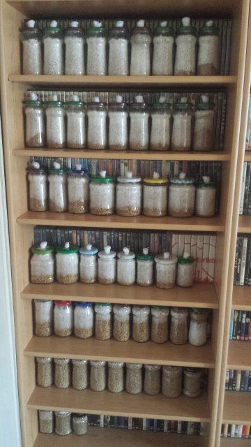 meine Brut stelle ich fogendermaßen her: Ich nehme geschälten Weizen und weiche ihn für ca. 24 Stunden ein, fülle diesen dann in Gläser und sterilisiere ihn dann im Dampfkochtopf für ca. 90 Minuten. Nach dem Abkühlen fülle ich dann ca. 1cm hoch bereits durchwachsenen Weizen oben drauf und das Ganze wandert dann ins Regal. Bei meinen Kräuterseitlingen läuft es leider nicht so gut wie bei den Austernseitlingen. Das Myzel durchwächst zwar relativ schnell den Weizen in den Gläsern ( etwas langsamer als das Austernmyzel ), aber sobald ich damit die Eimer beimpfe fangen die Schwierigkeiten an. Beim 1. Versuch habe ich das Myzel meiner Meinung nach regelrecht ertränkt, denn als ich nach ca. einer Woche einen Blick in die Eimer warf war vom Myzel nichts mehr zu sehen, aber Staunässe war reichlich vorhanden ( Substrat waren Strohpellets ). Der 2. Versuch läuft gerade ( Strohpellets mit Kaffeesatz ), aber das Ganze kommt nicht so recht in die Gänge. Jetzt ist zwar keine Nässe vorhanden, aber eventuell machen ja die Temperaturen dem Myzel zu schaffen ( 24 Grad am kühlsten Platz in der Wohnung ) ??? Welche Temperatur zum Durchwachsen des Substrats wäre denn eurer Meinung nach am besten ?? Im Netz findet man da ja sehr widersprüchliche Angaben.... Im Anhang mal ein Bild der noch übriggebliebenen KS-Brut.