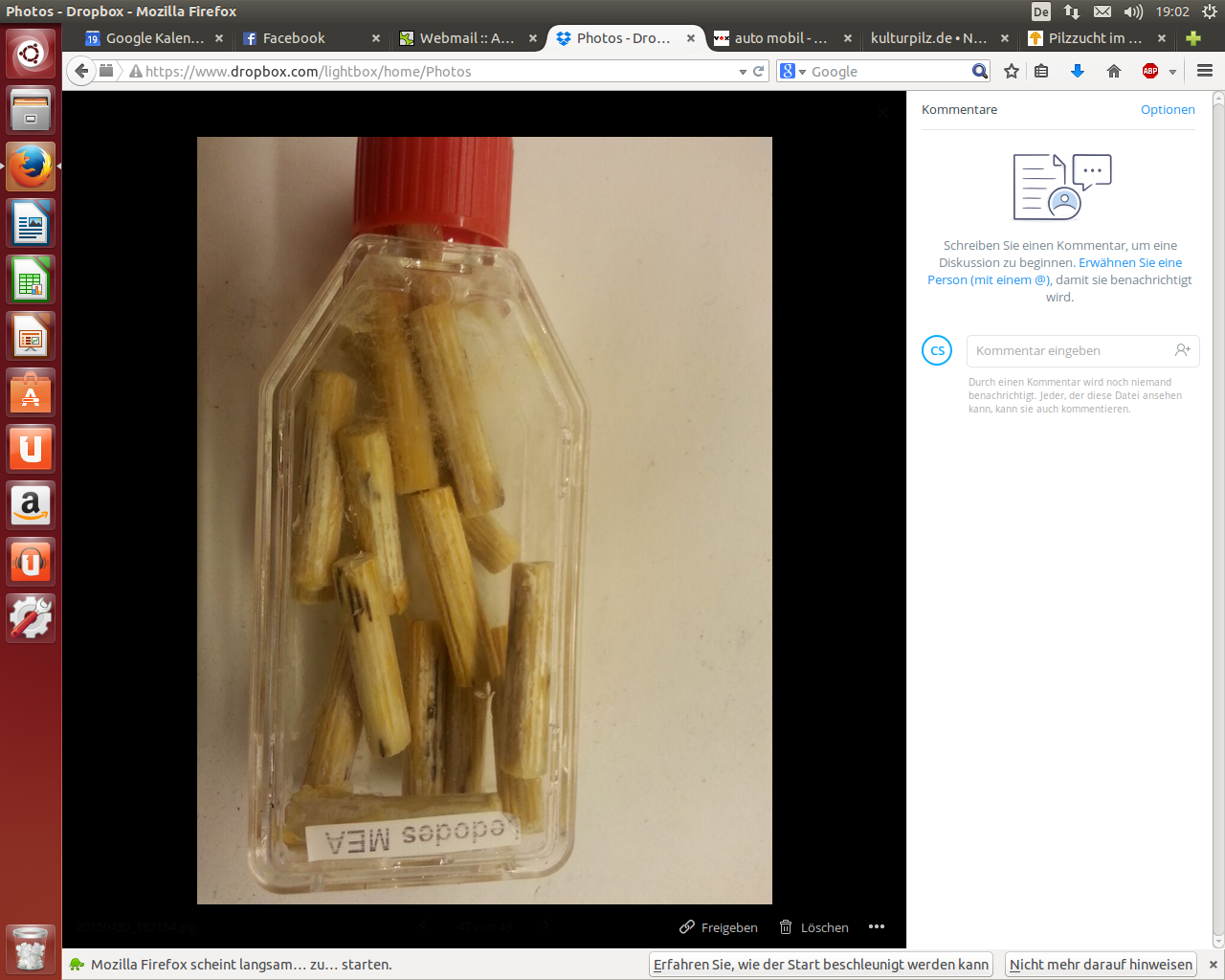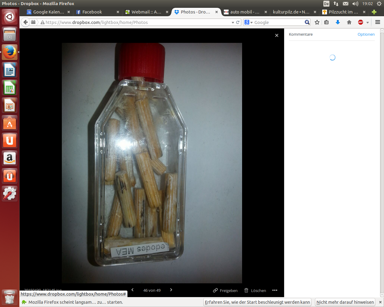 ich wollte mich mal an Impfdübeln versuchen. Dazu habe ich MEA-Nährlösung (Malzextrakt, Pepton, Hefeextrakt) in eine Zellkulturflasche gefüllt, mit Shii-take beimpft und diese durchwachsen lassen. Als der Boden vom Piz bedeckt war ( nichts optisch auffälliges) habe ich autoklavierte Buchendübel hinzugegeben und diese auch durchwachsen lassen.
