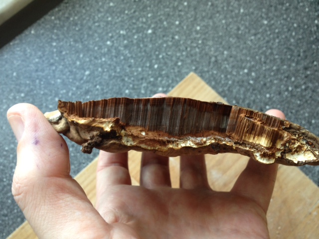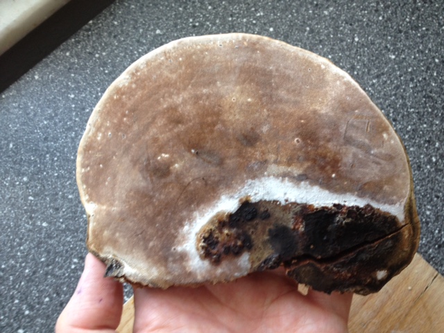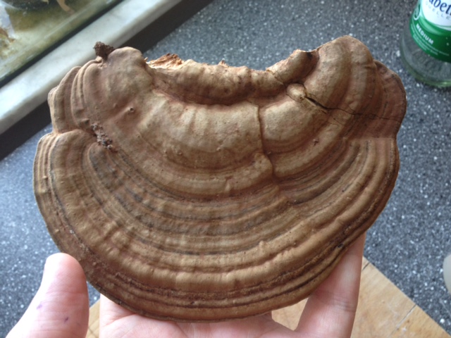 Ich glaube, Du hast statt Reishi/Glänzender Lackporling/Ganoderma lucidum den Flachen Lackporling/Ganoderma applanatum gefunden. Die beiden sind nahe verwandt, und laut Jan Lelley hat G. applanatum sehr ähnliche Wirkstoffe wie G. lucidum.