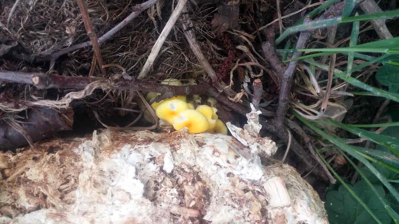 Diese "Freilandpilze" unterscheiden sich vom äußeren her deutlich von denen, die im Haus gezogen wurden. Klein sind die Zitronenseitlinge quittengelb, ein richtig kräftiges Gelb, im Büro waren sie eher blaßgelb. 2 Tage später haben sie eine Größe erreicht, die mich auch erstaunt. Die Größe einer Untertasse ist keine Übertreibung.