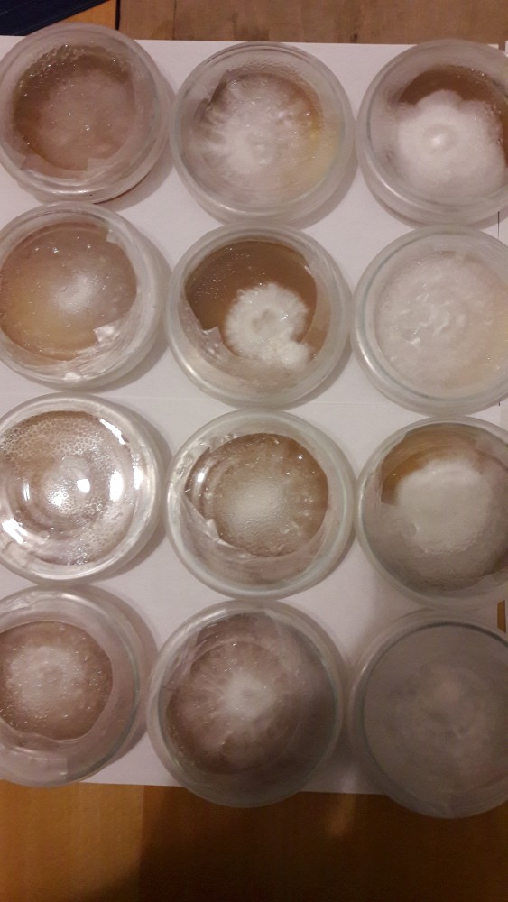 Bisher wurden noch keine Kontis entdeckt. Heute wird unser kleiner Arbeitskreis auf der HEPA-Werkbank versuchen mit gerade eben erworbenen Wochenmarktpilzen (Sommeraustern (vermuten wir, da die Hutfarbe weiß ist), Kräuterseitlingen, Shiitake) erfolgreich zu klonieren. Wir halten euch auf dem Laufenden!